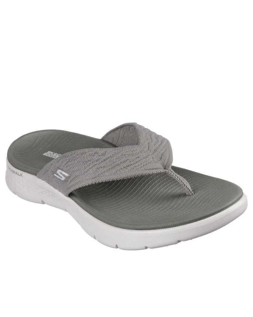 Stay ready for anything sand, sea or in between wearing Skechers GO WALK® Flex Sandal - Splendor. This 3-point thong style features an engineered knit upper with a contoured Goga Mat® footbed and lightweight ULTRA GO® cushioning.