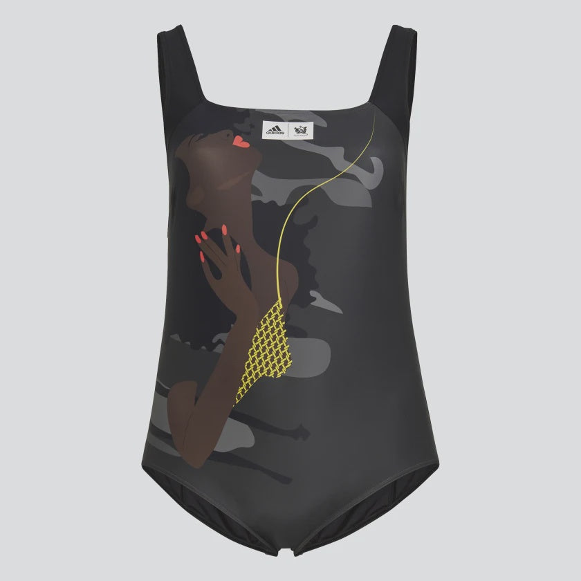 Designed in collaboration with South African brand Thebe Magugu, this adidas swimsuit brings joyful vibes to your swim sessions. Chlorine-resistant fabric has a soft, comfortable feel. An inner bra with removable pads provides a medium level of support. The colorful artwork of a woman dancing has a celebratory feel.