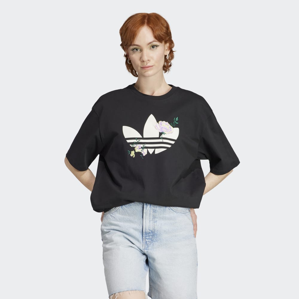 ADIDAS EMBROIDERED FLOWER TREFOIL T-SHIRT - BLACK