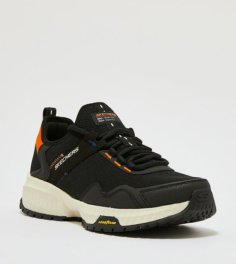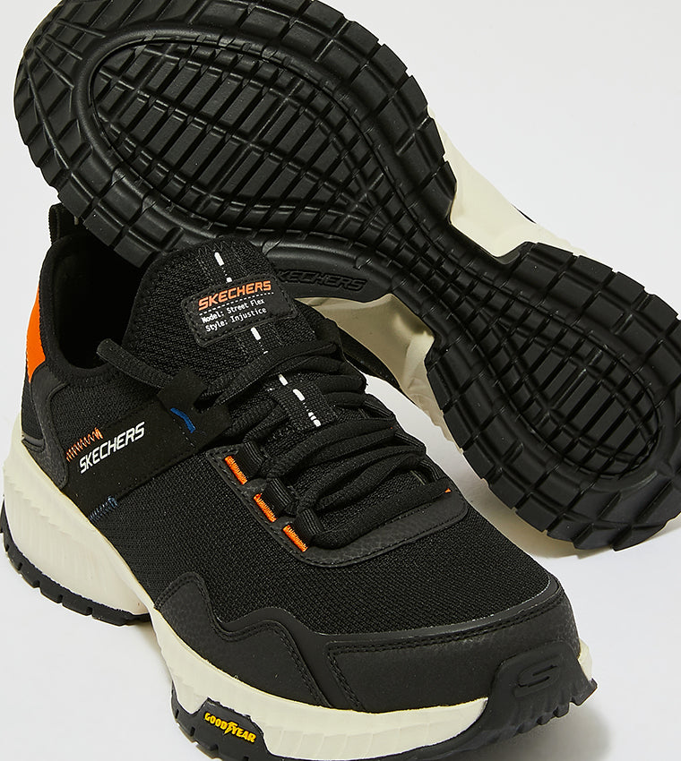 Use every advantage of sleek sporty style and high traction with the Skechers Street Flex - Injustice shoe. Soft sport suede, sleek sporty mesh fabric and synthetic upper in a slip on stretch laced athletic training sneaker with stitching and overlay accents. Air-Cooled Memory Foam insole, Goodyear Rubber outsole Construction: Sport suede upper Sleek knit mesh fabric and synthetic panels Slip on stretch laced front athletic training sneaker design Stitching accents Suede panels at toe, sides and heel Metallic synthetic detail on front and sides Matching and contrast colored stitching accents Printed logo detail on sides and tongue Smooth clean fabric front and side panels Heel overlay with pull-on heel loop Stretch laced front panel for easy slip on fit Padded collar Soft fabric shoe lining Air-Cooled Memory Foam cushioned comfort insole Shock absorbing flexible design midsole Tapered midfoot design and flex design midsole sides 1 1/4 inch heel Matching or contrast colored high traction outsole Goodyear rubber outsole provides durability and traction