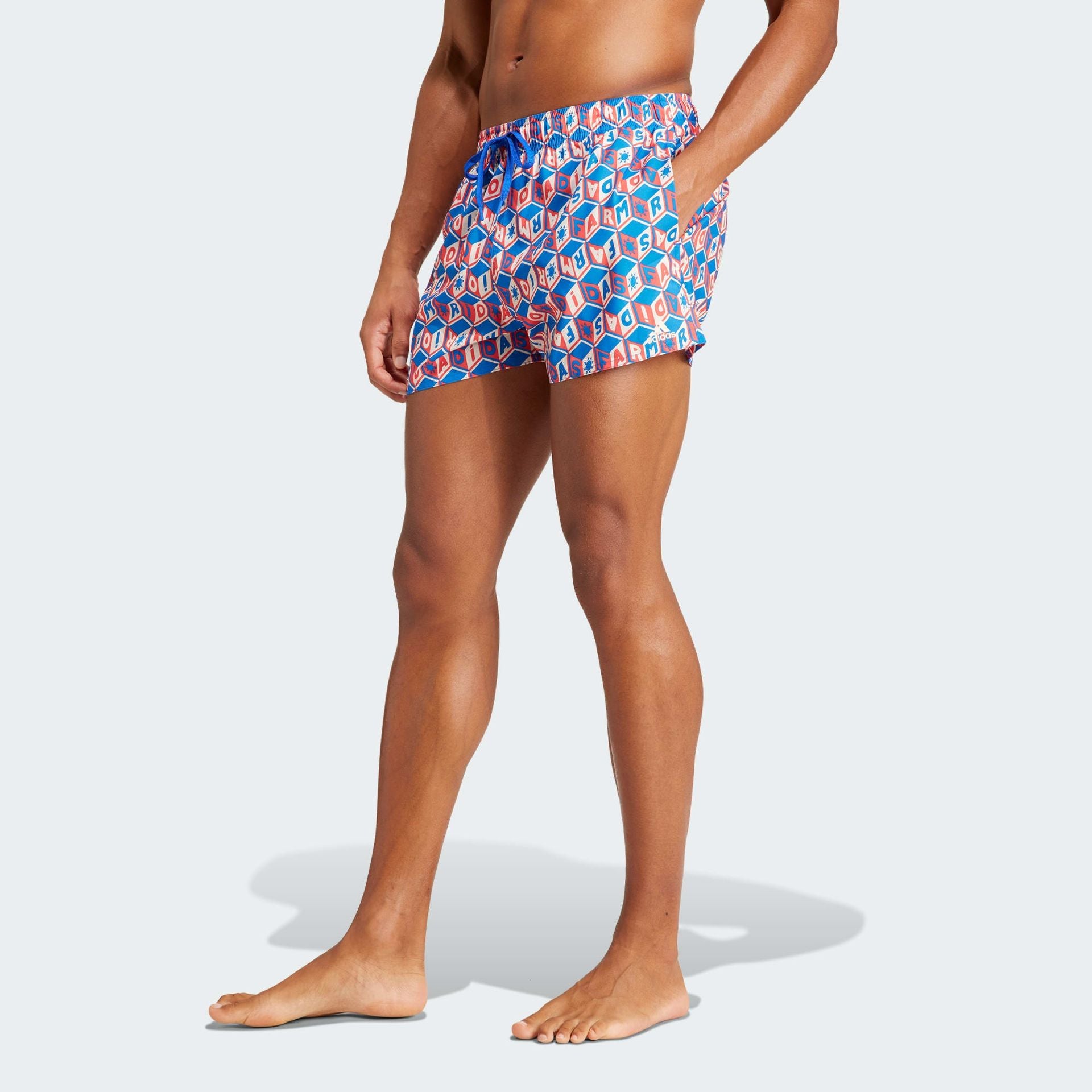 You'll be ready for carefree summer adventures with these adidas swim shorts. Inspired by the dazzling display of kaleidoscopic sun rays on a beach, the shorts feature a harmonising print of wavy lines and distorted fragments that evoke a bohemian vibe. The adidas and FARM Rio collaboration combines the sports expertise of the former with the vibrant creativity of the latter, a Brazilian design firm. Whether you're dipping in the waves or strolling the boardwalk, these swim shorts keep you stylishly equipped for sun-drenched days. This product is made with 100% recycled materials. By reusing materials that have already been created, we help to reduce waste and our reliance on finite resources and reduce the footprint of the products we make.