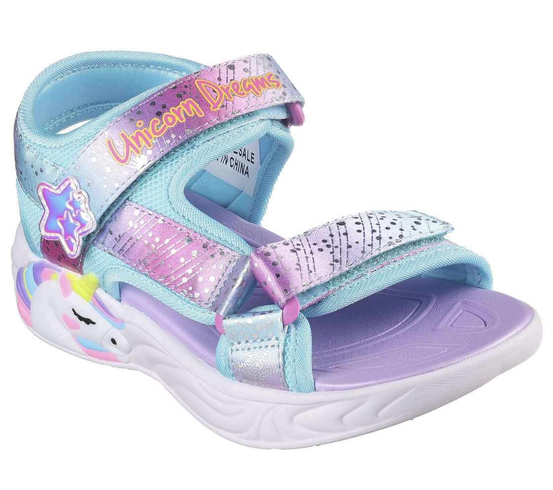 Brighten up your day with a little unicorn magic wearing Skechers S-Lights: Unicorn Dreams - Majestic Bliss. This light-up sandal features an ombre satin fabric and mesh upper with a cushioned comfort insole.