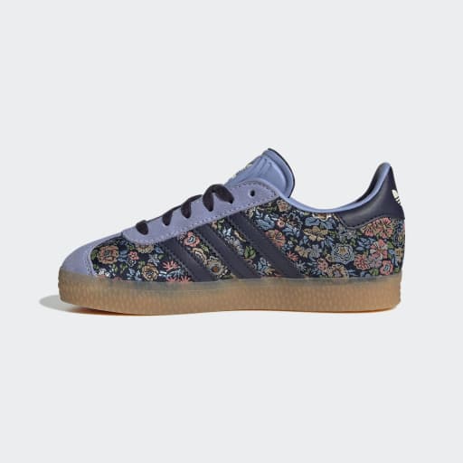 Designed in collaboration with the luxury department store Liberty London, these juniors' adidas Gazelle shoes burst into the world with an expressive allover floral graphic. Pebble-textured sidewalls and honeycomb traction mark the low-profile rubber outsole, with contrasting T-toe and lace overlays in one sprightly shade, heel tab and 3-Stripes in another. Gold-letter Gazelle branding put on the finishing touch. A perfect blend of sporty and luxury, these Gazelles bloom with colorful style that looks great with jeans, shorts or whatever works.