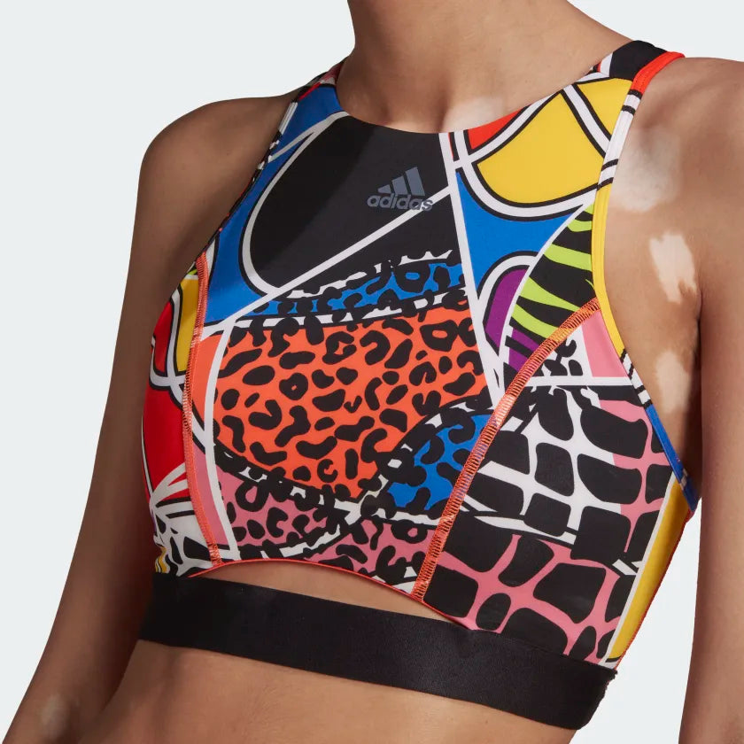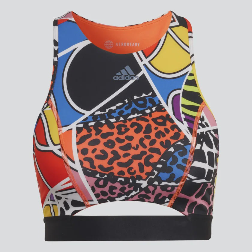 Channel your inner cheetah as you run and train in this adidas bra made in collaboration with South African designer Rich Mnisi. It shows off a combination of animal- and city-inspired graphics. Buttery-soft fabric and targeted compression zones work together to create a cozy, supportive feel. AEROREADY ensures you stay dry through it all. Made with a series of recycled materials, and at least 60% recycled content, this product represents just one of our solutions to help end plastic waste.
