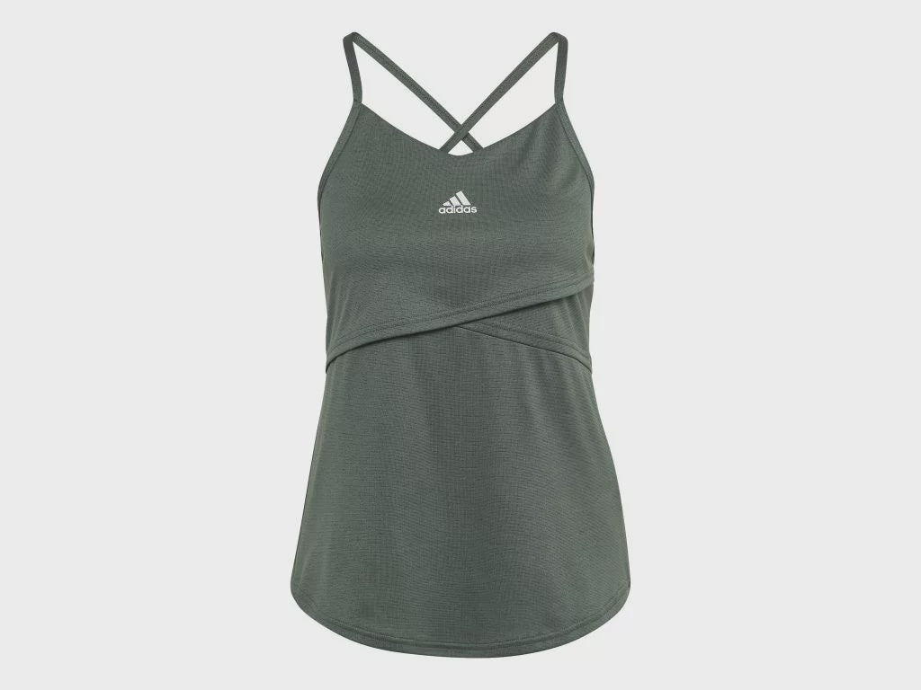 Undershirt Take a deep breath and focus on stretching. In this tank top, you can enjoy everything from dancing to yoga without restrictions. Its construction with an elastic strap on the back perfectly holds it in place and follows your movements, it has charming seam layers and thin straps, and thanks to the AEROREADY absorption treatment, you will always be on your toes. Narrow cut. AEROREADY absorption treatment. Thin crossed straps on the back.