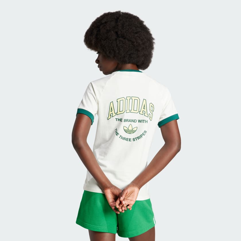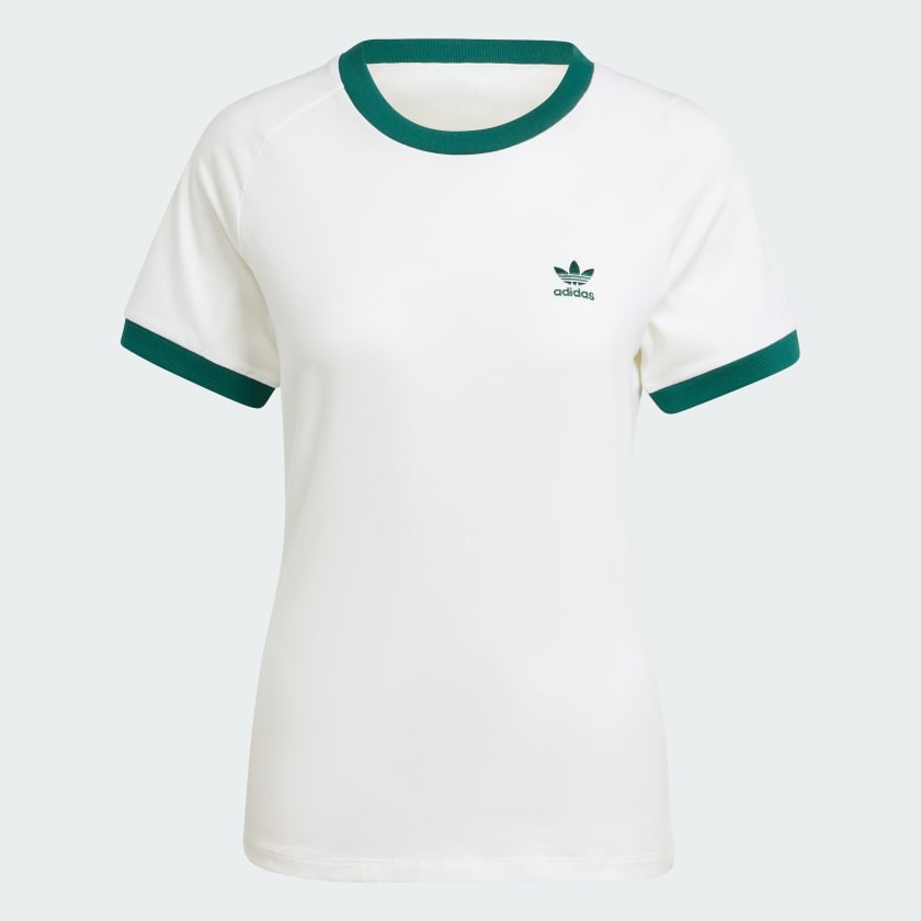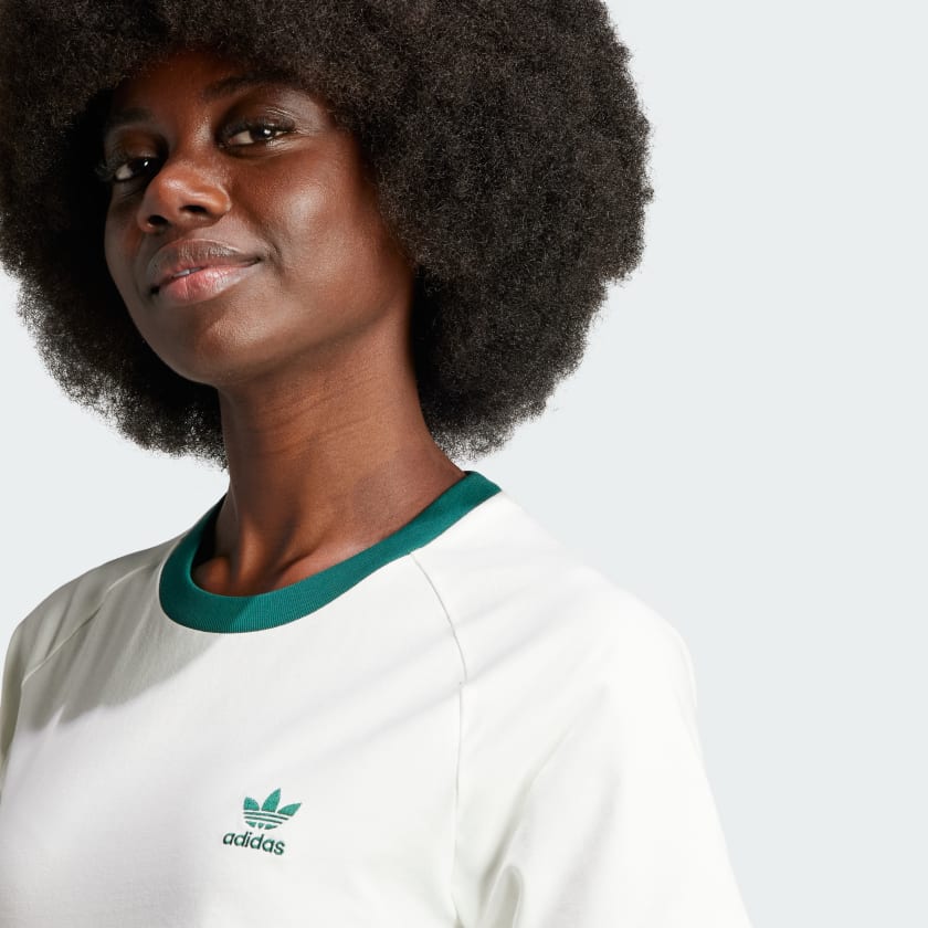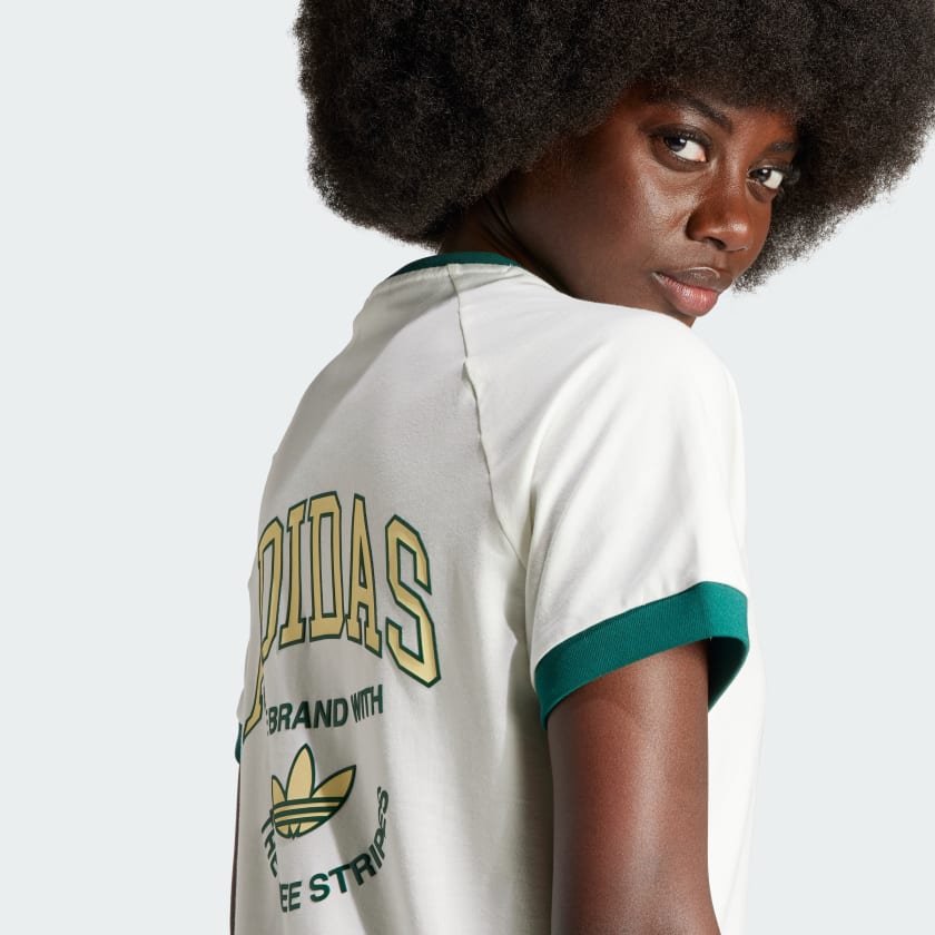 This adidas tee is inspired by retro athletic wear. It has a slim cut that hugs close, but the soft and stretchy cotton-blend fabric keeps you feeling comfortable and unconstrained. Ribbed cuffs finish the sleeves, giving the look an authentic throwback vibe. Whether you pair it with joggers for an active day or distressed denim for nights out, the tee transitions seamlessly with style.
