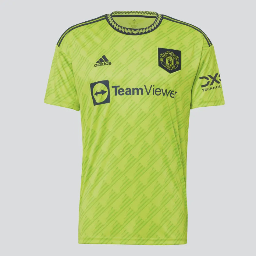 Created to catch the eye at rivals' grounds. This adidas Manchester Untied third jersey highlights electrifying away performances with bold colors and a dynamic, '90s-style graphic. Shared with the home and away kits, an embroidered shield badge takes pride of place on the chest. Behind the brilliance, moisture-absorbing AEROREADY keeps soccer fans comfortable. Made with 100% recycled materials, this product represents just one of our solutions to help end plastic waste.