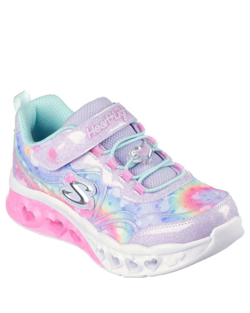 Brighten your steps with heart-filled style wearing Skechers Flutter Heart Lights® - Groovy Swirl. This lighted design features a multicolor glitter print fabric upper with synthetic glitter overlay, stretch laces with heart charm, and adjustable instep strap.