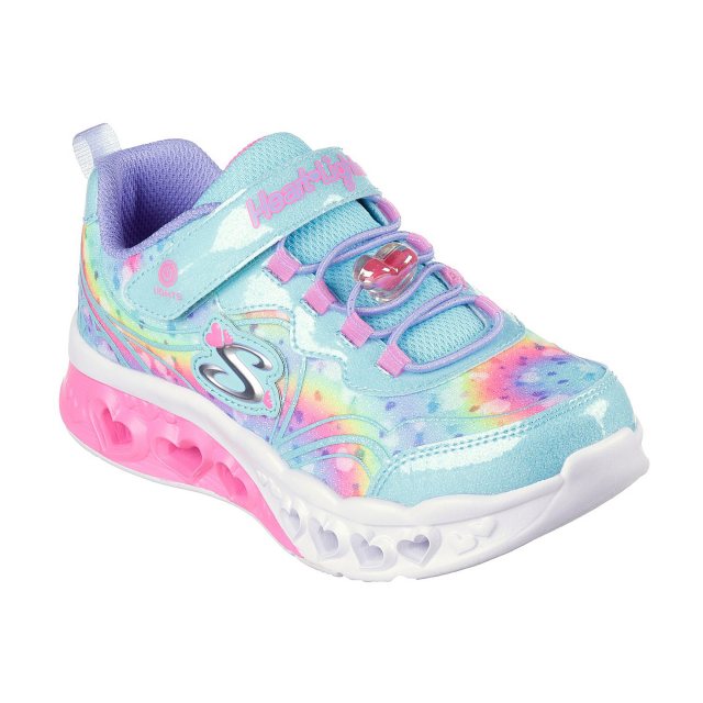 Brighten your steps with heart-filled style wearing Skechers Flutter Heart Lights® - Groovy Swirl. This lighted design features a multicolor glitter print fabric upper with synthetic glitter overlay, stretch laces with heart charm, and adjustable instep strap.