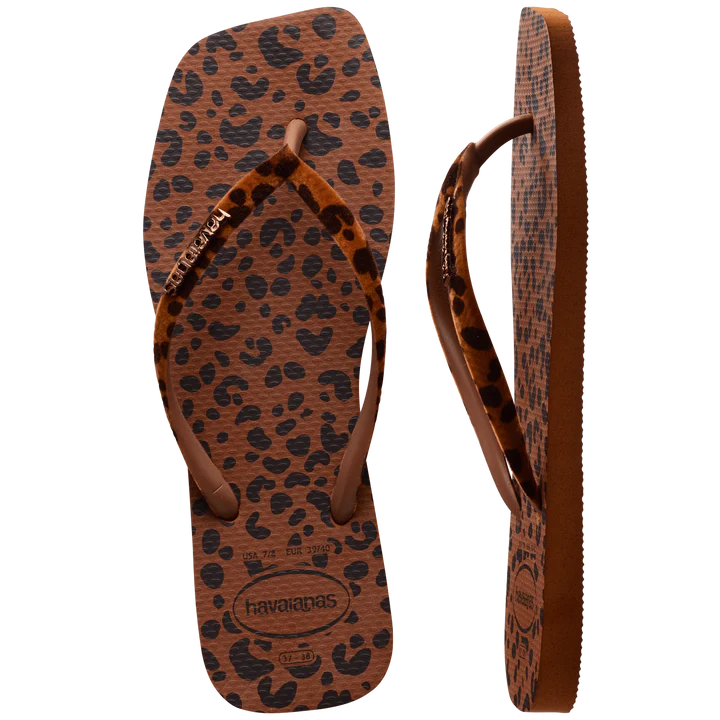 Some Slim square Havaianas, yes, with thinner straps, but totally different: with a squarer shape, animal print and straps with a velvety touch. It's very elegant!