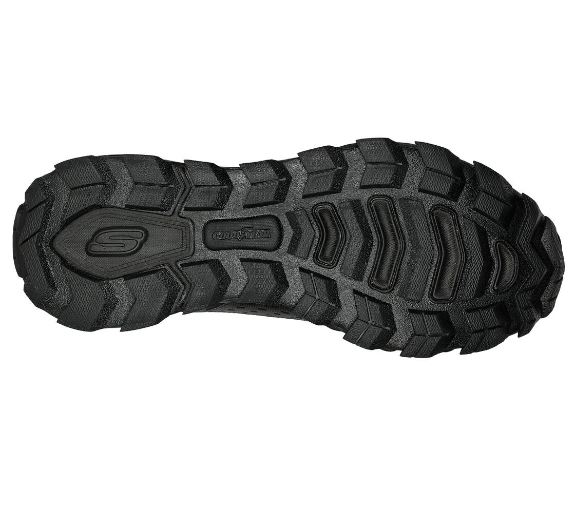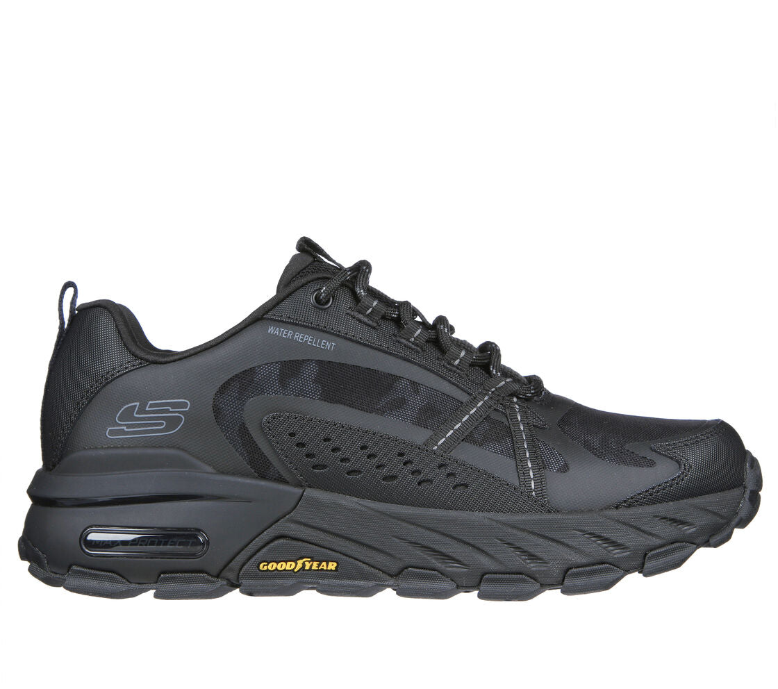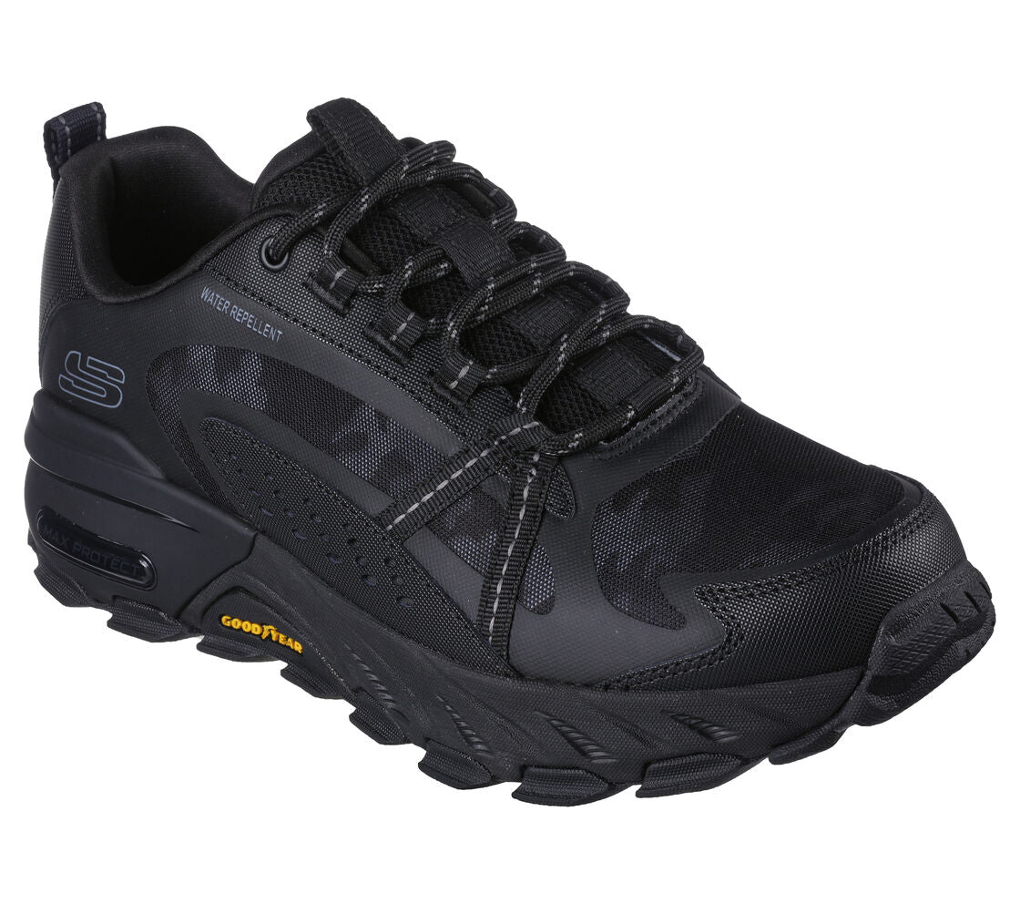 Athletic comfort and durable traction combine in Skechers Max Protect - Task Force. This lace-up outdoor trail style features a 3M® Scotchgard® treated water-repellent leather and synthetic upper with a Skechers Air-Cooled Memory Foam® insole and an anti-slip Goodyear® performance outsole.
