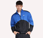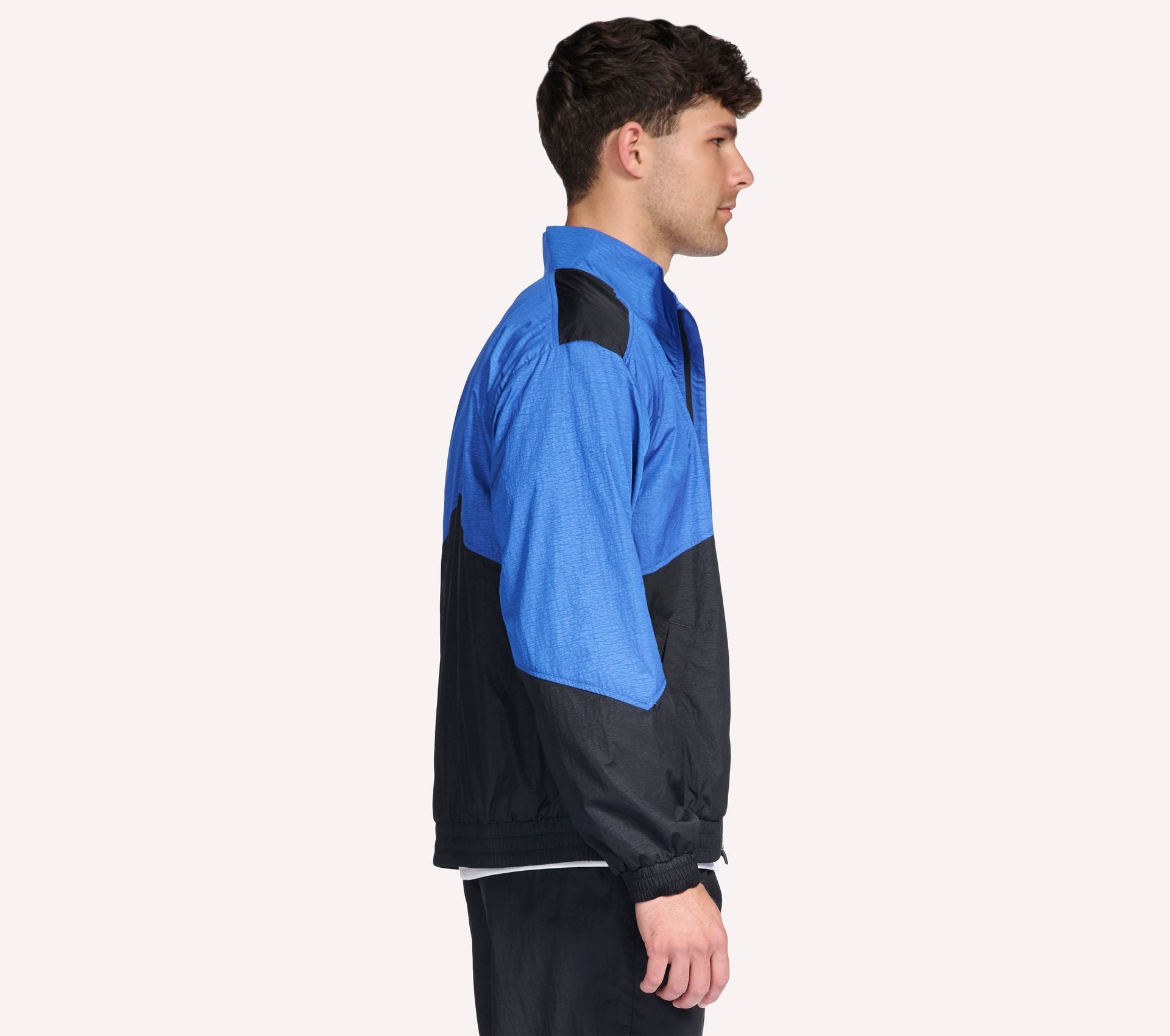 Rewind to vintage-inspired track performance style wearing Skechers GO SHIELD™ Pace Jacket. This full-zip outerwear design is made from our lightweight GO SHIELD Crinkle™ fabric and features angular color blocking on the body and sleeves, welt hand pockets, plus elasticized hem and cuffs. Part of a coordinating apparel set.