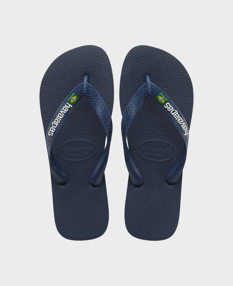 Navy blue flip-flops with white logo and brazil flag. Comfortable,durable, lightweight, heat-resistant, non-slip and water-resistant. Havaianas flip flops are small fitting, we suggest you purchase a size larger than your normal size.