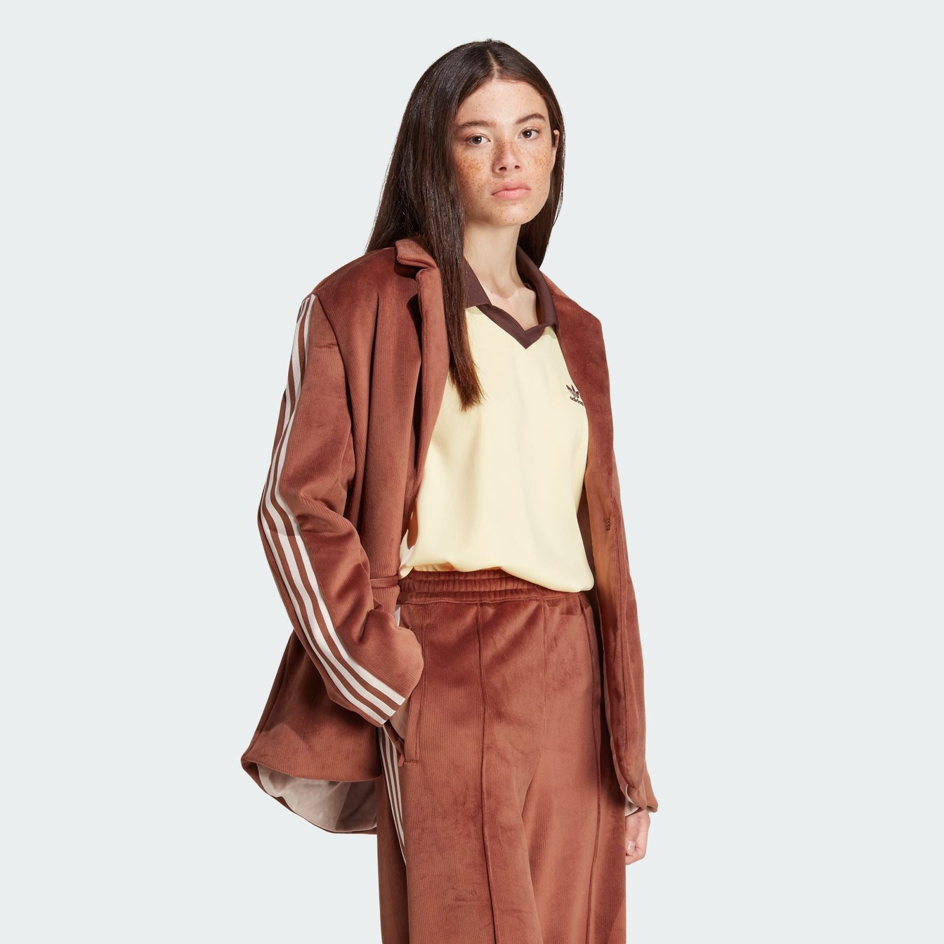 Luxurious and loose, this adidas top layers on the casual comfort with a satiny finish. Polo styling at the collar eases into a flowy shape, designed to slip on and go. Subtle shimmer catches the light with every move, and the loose fit creates space to settle in. Signature 3-Stripes down the arms stand out in sporty contrast, connecting this laid-back and luxe look to athletic origins.