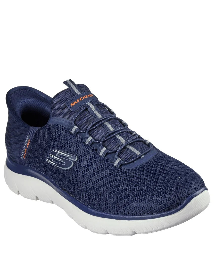 Step into easy-wearing comfort with Skechers Hands Free Slip-ins®: Summits - High Range. Along with our Exclusive Heel Pillow™ that holds your foot securely in place, this vegan style features a unique Skechers Slip-ins® molded heel panel, a mesh upper with fixed laces, and a cushioned Skechers Air-Cooled Memory Foam® insole.