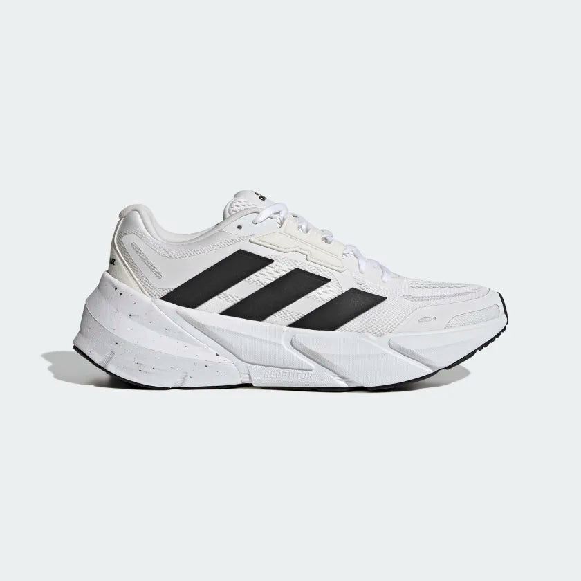 The distance running shoe inspired by the idea of perpetual motion and tested over 4,500 km. Adistar combines a soft, lightweight REPETITOR foam platform with REPETITOR +, a firmer foam, to create a dual density midsole. The firmer 15% recycled EVA in the heel protects and helps stabilize any heel strike. Forward propulsion is enhanced by the rocker geometry as well as an overall 6mm drop heel to toe. Strike soft and push forward with a shoe designed to go the distance.