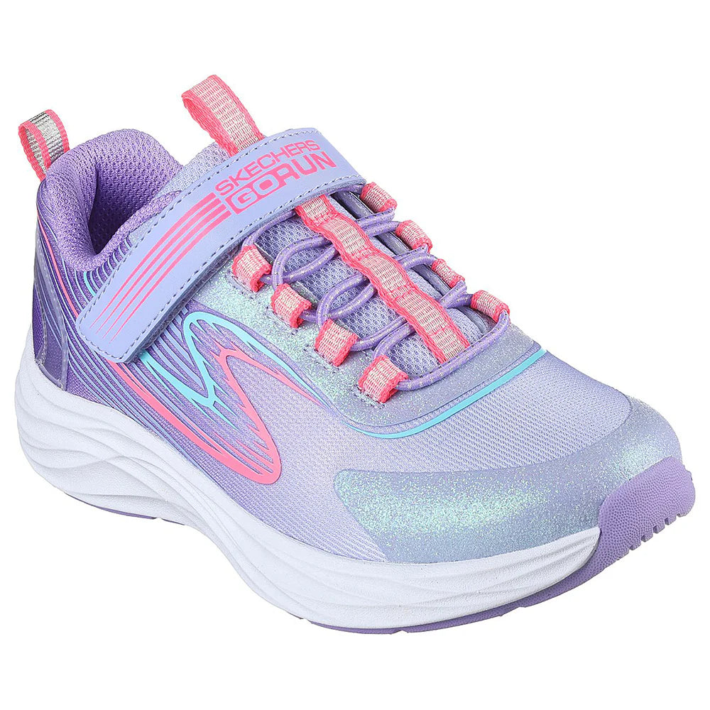 Active kids keep going strong wearing Skechers GO RUN® Accelerate. This lightweight training design features a stretch-laced glitter mesh upper with a cushioned Skechers Air-Cooled Goga Mat™ insole and a rubber-infused bottom plate.