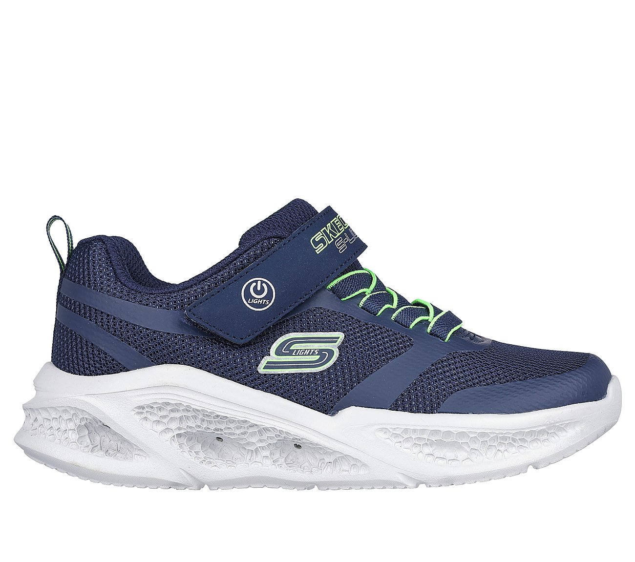 Illuminate your steps in sporty style and comfort with Skechers S-Lights®: Meteor-Lights. This stretch-laced design has a mesh and synthetic upper, plus a fun light-up midsole.