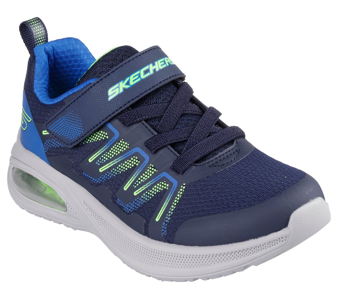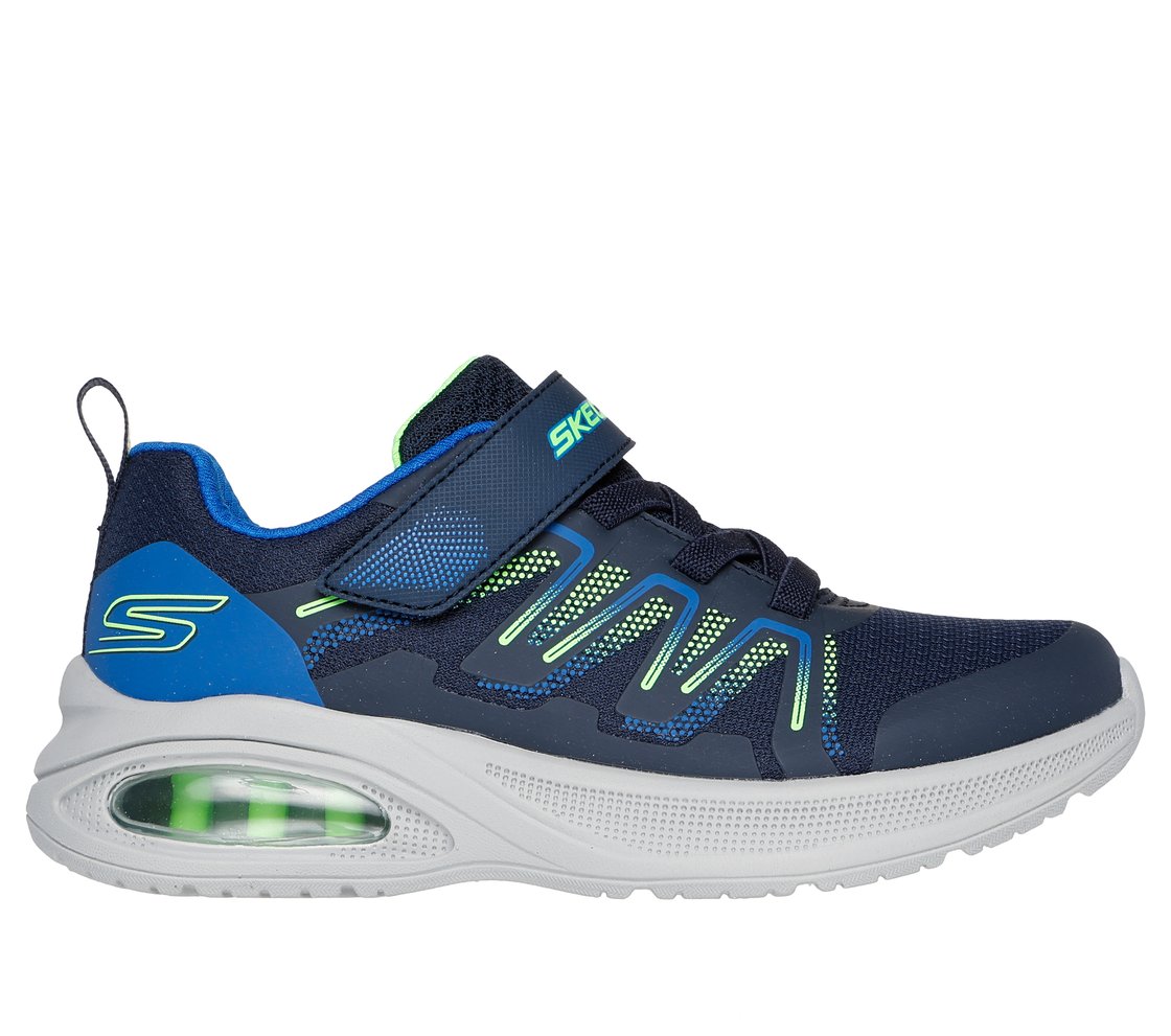 Play all day in easy-wearing comfort with Skechers Microspec Max Advance - Speker. This lightweight stretch-laced design features a mesh and synthetic upper, adjustable instep strap, visible Skech-Air® airbag midsole, and a cushioned comfort insole.