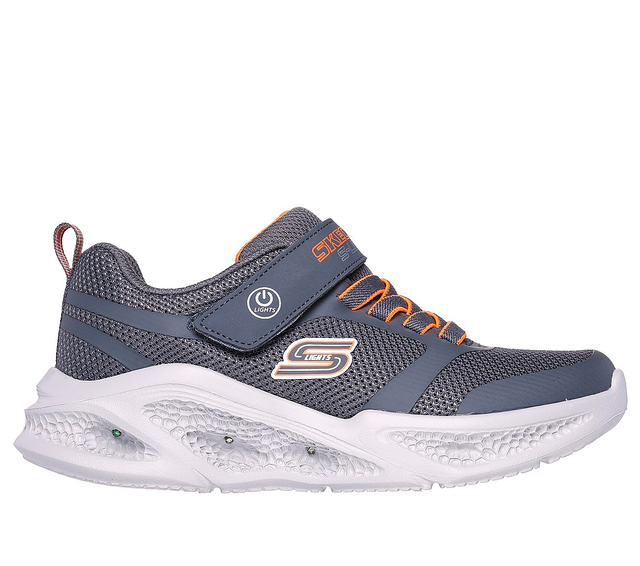 Illuminate your steps in sporty style and comfort with Skechers S-Lights®: Meteor-Lights. This stretch-laced design has a mesh and synthetic upper, plus a fun light-up midsole.