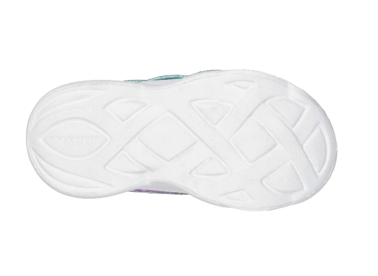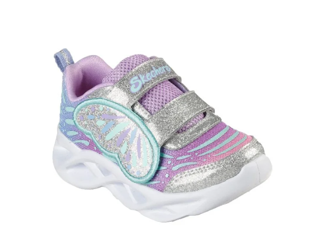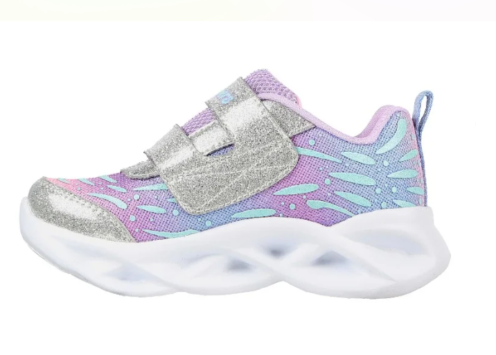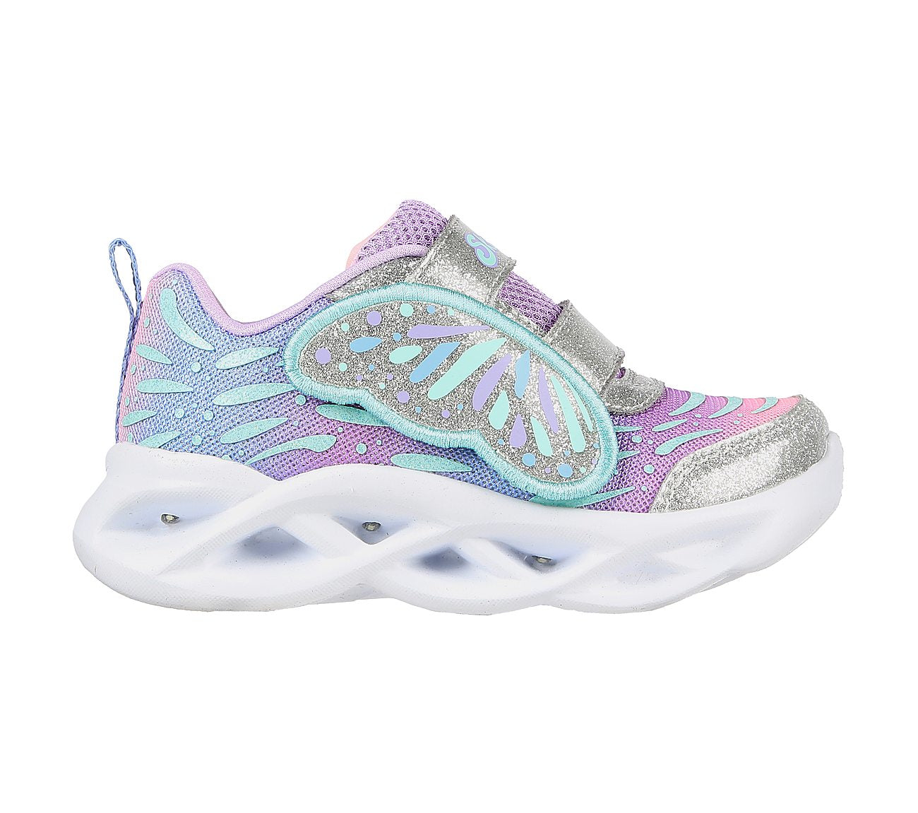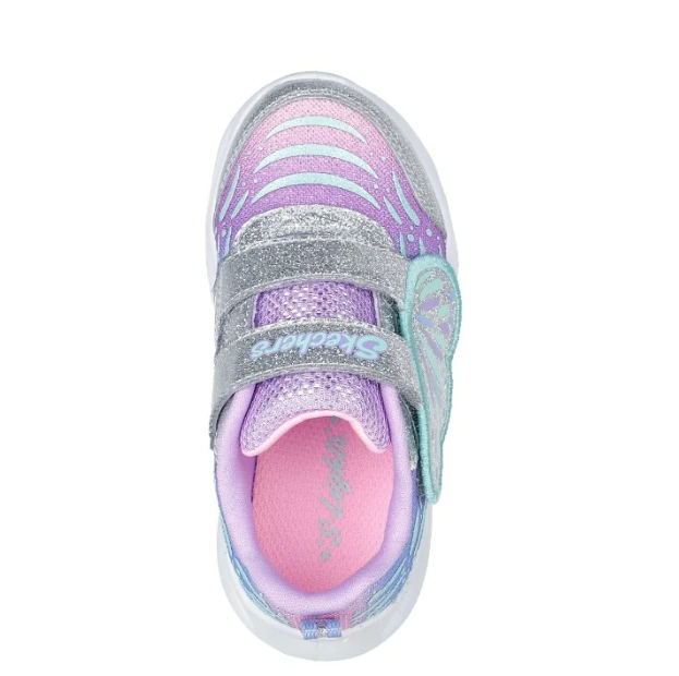 Dazzle your steps in style and comfort with Skechers S-Lights: Twisty Brights - Wingin' It. This casual lightweight slip-on features a mesh and glitter synthetic upper with butterfly wing instep strap, plus a light-up midsole.