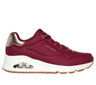 Step into the spotlight with the Skechers Uno 'Shimmer Away Red' sneakers! These eye-catching kicks feature a dazzling burgundy glitter upper that will turn heads wherever you go. The comfortable Memory Foam insole provides all-day support, while the chunky platform sole adds a touch of height and style. Whether you're hitting the streets or the dance floor, these sneakers are sure to make a statement.