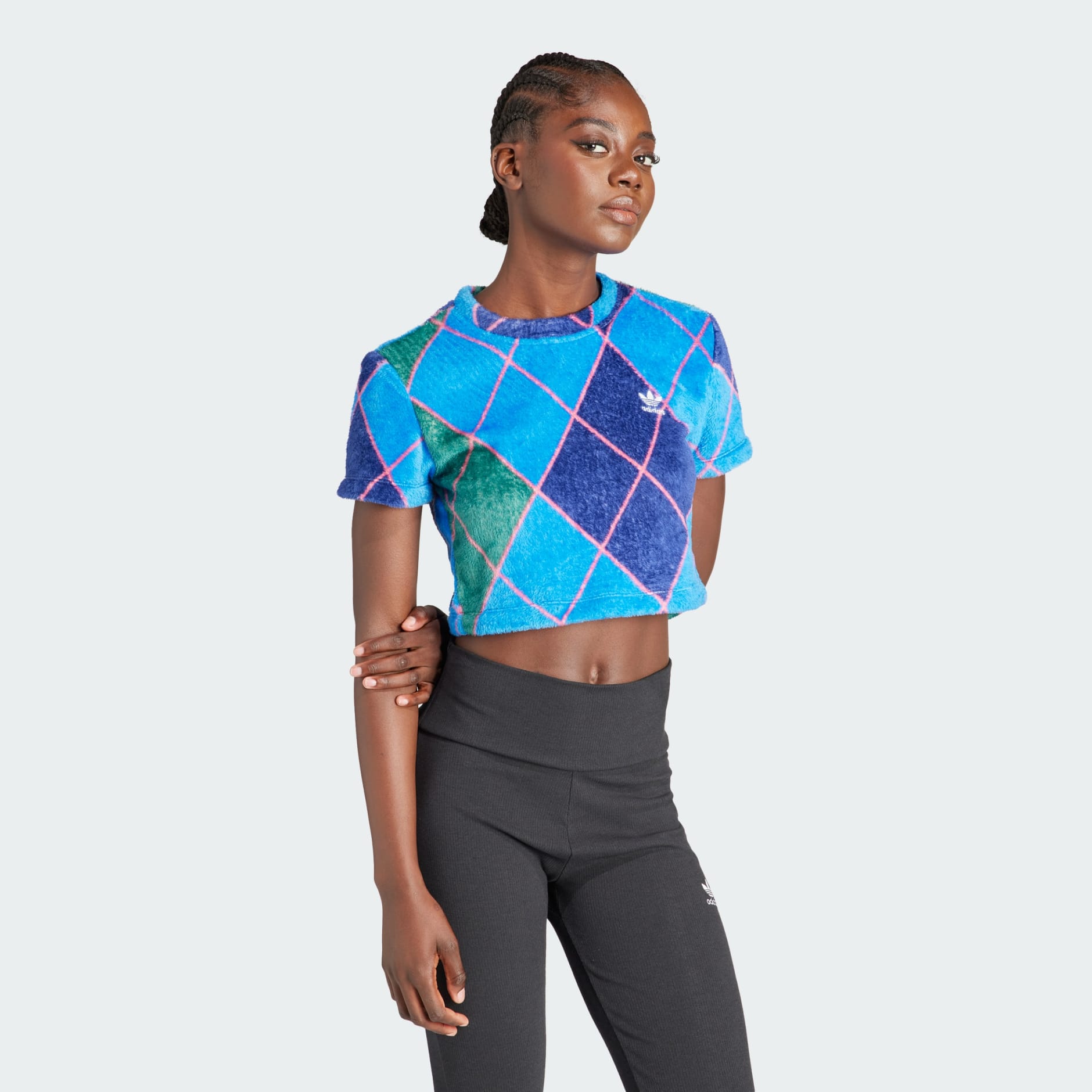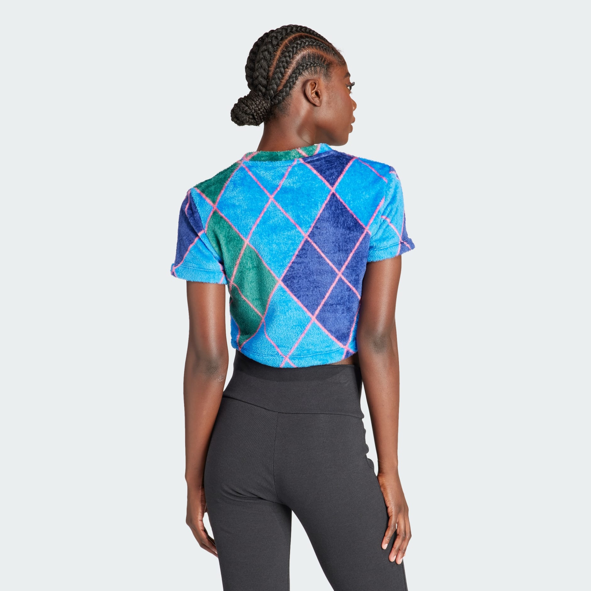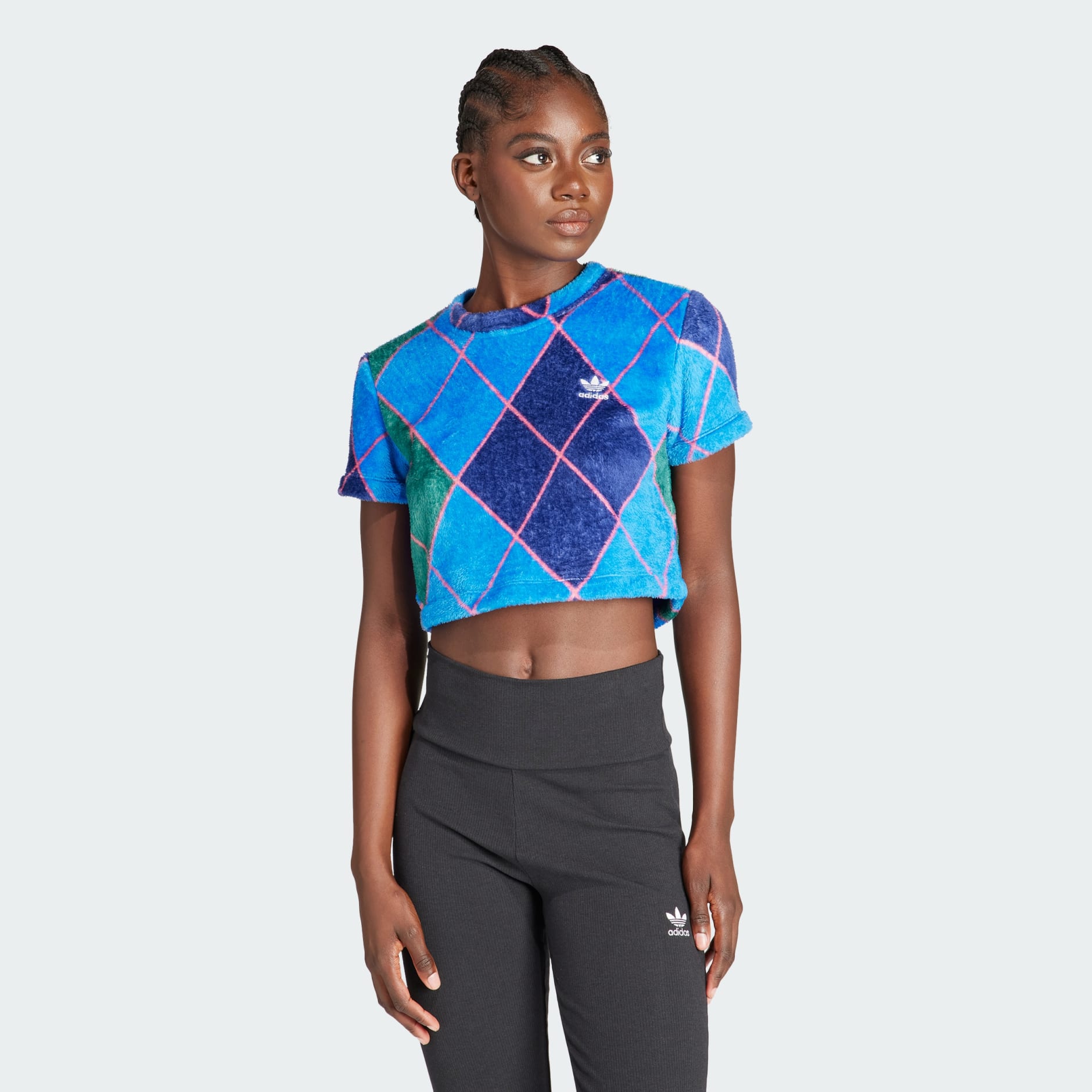 Theres no mistaking that this adidas tee got its inspiration from style on the golf course. The allover argyle print is oversized and sporty while the crop fit gives it a touch of attitude. As for the material, youll never want to take it off — soft, fluffy, cosy and just right. Made with 100% recycled materials, this product represents just one of our solutions to help end plastic waste.