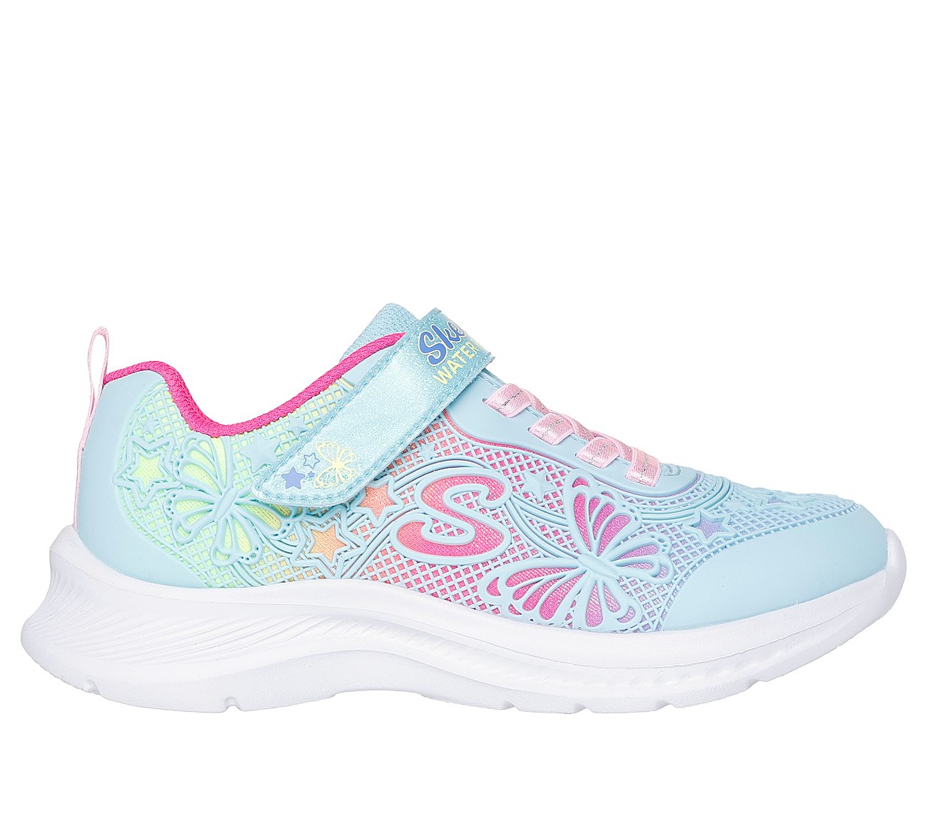 Take on the day in colourful comfort wearing Skechers Jumpsters. This sneaker features a synthetic multicolour upper with a padded mesh tongue, stretch laces and an adjustable instep strap closure.