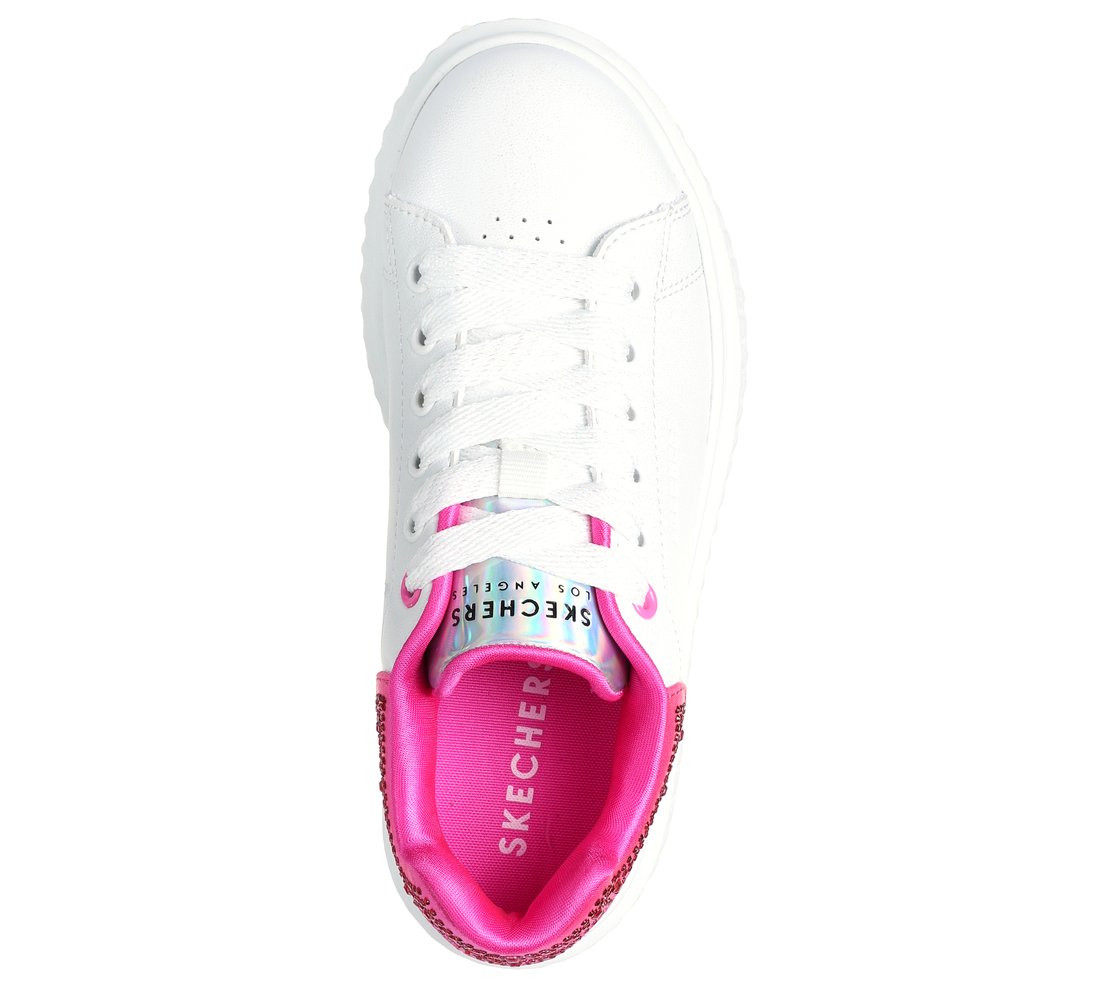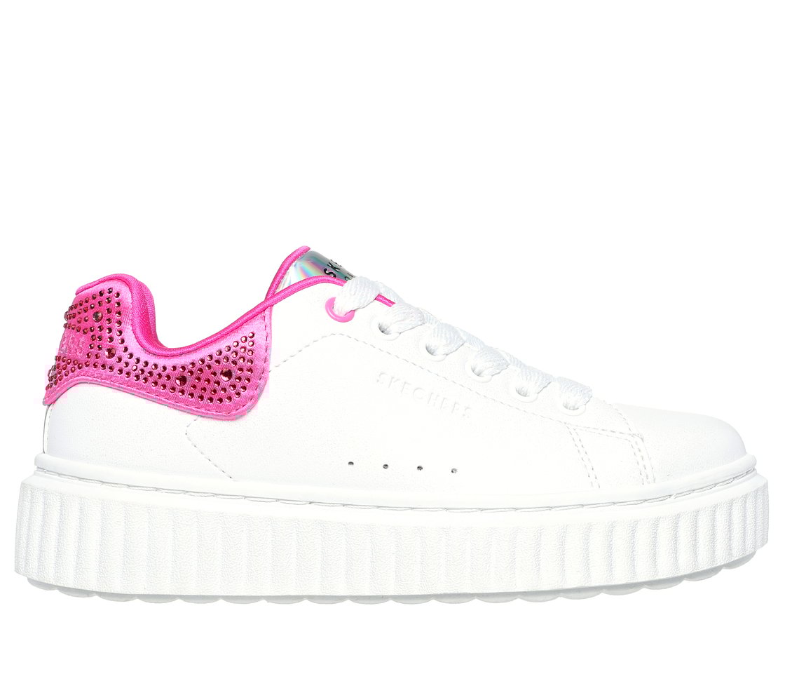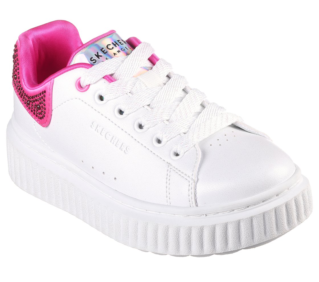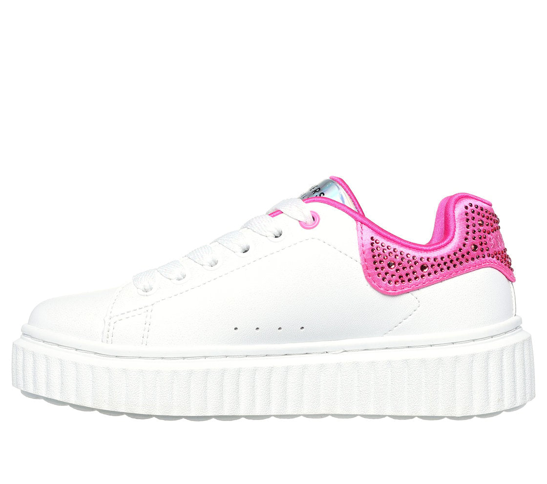 Get gem-tastic style in heightened comfort with Skechers Street™ Hi Ridge. This lace-up fashion sneaker features a synthetic upper with rhinestud embellished heel trim, a cushioned comfort insole, and platform outsole.