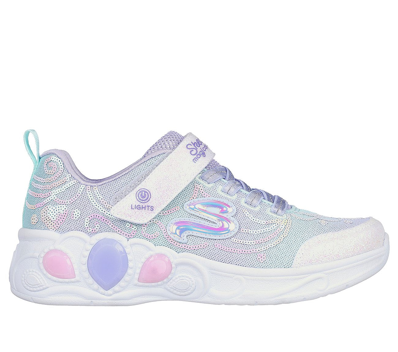 Light up your steps with royally cute style in Skechers S-Lights®: Princess Wishes. This sporty Magical Collection® themed design features a glittery mesh and sequin embellished upper with stretch laces, adjustable instep strap, cushioned comfort insole, and a light-up midsole. Bonus wand included as a gift with purchase.