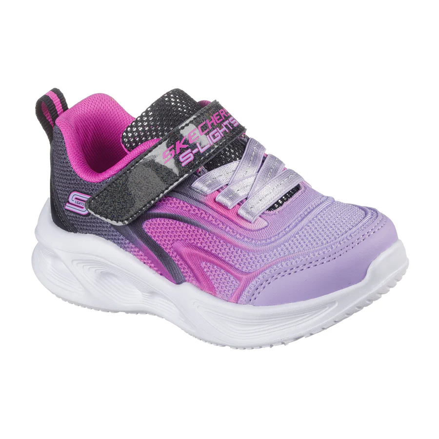 Light up the playground in colourful fun with Skechers S-Lights®: Sola Glow - Colour Breeze. This Skechers adaptive closure design features an ombré mesh and synthetic upper with embossed detail, an adjustable instep strap, fixed stretch laces, and a well-cushioned light-up midsole.