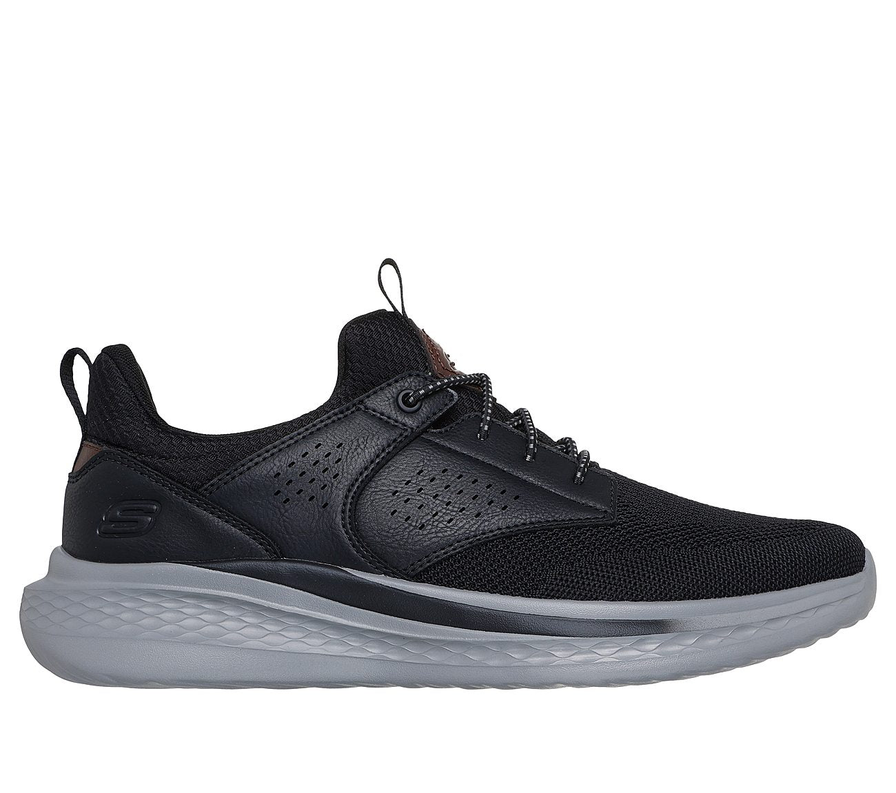 Classic modern style combines with comfort in Skechers Relaxed Fit®: Slade - Breyer. This stretch-laced vegan style features a mesh and synthetic upper with a charcoal-infused Skechers Air-Cooled Memory Foam® insole and a Skechers Goga Mat Arch™ for added support.
