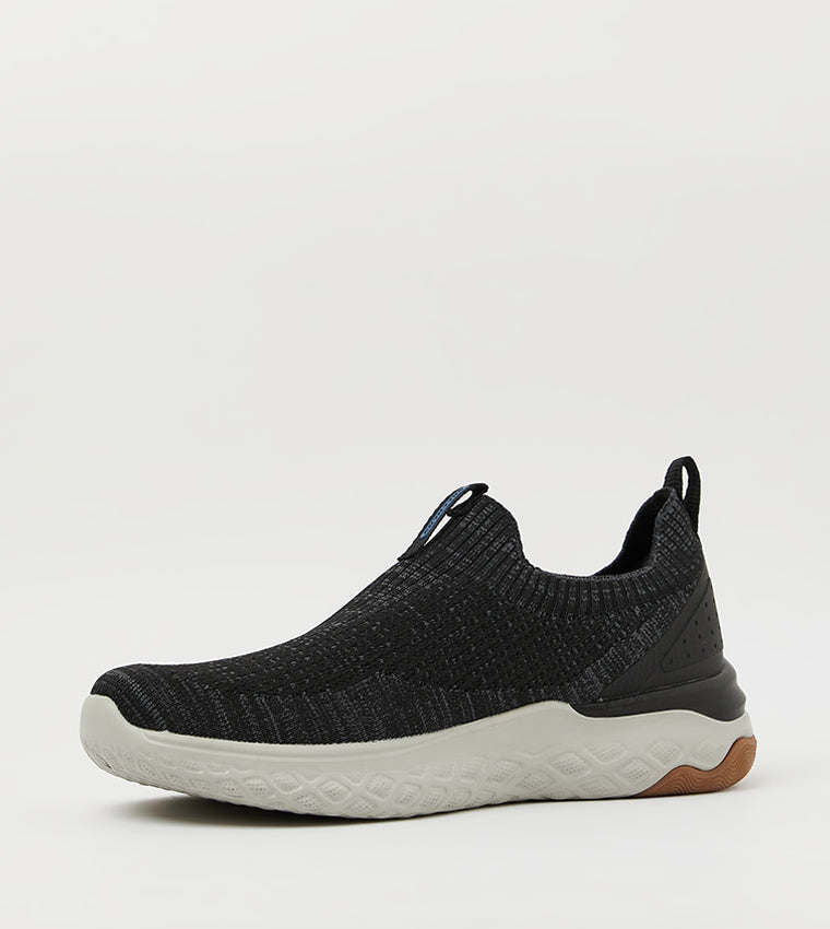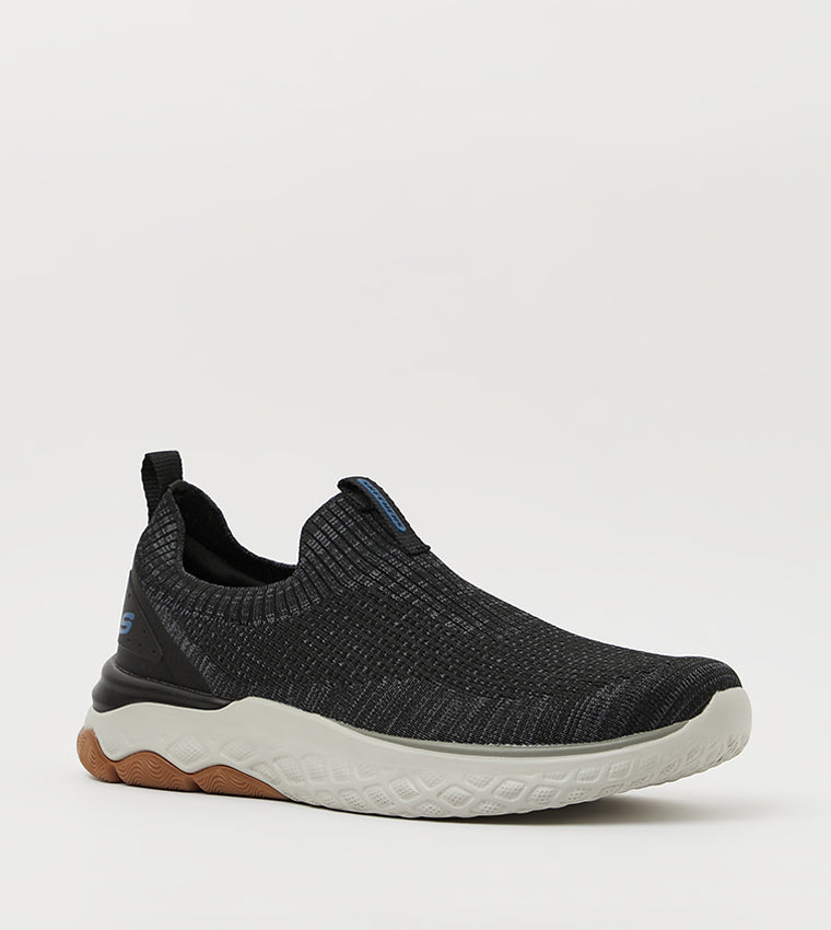 This vegan laceless design features a Stretch Fit® mesh upper with a reinforced synthetic heel, a cushioned Goga Mat Arch™, and a Skechers Air-Cooled Memory Foam® insole.