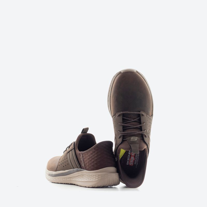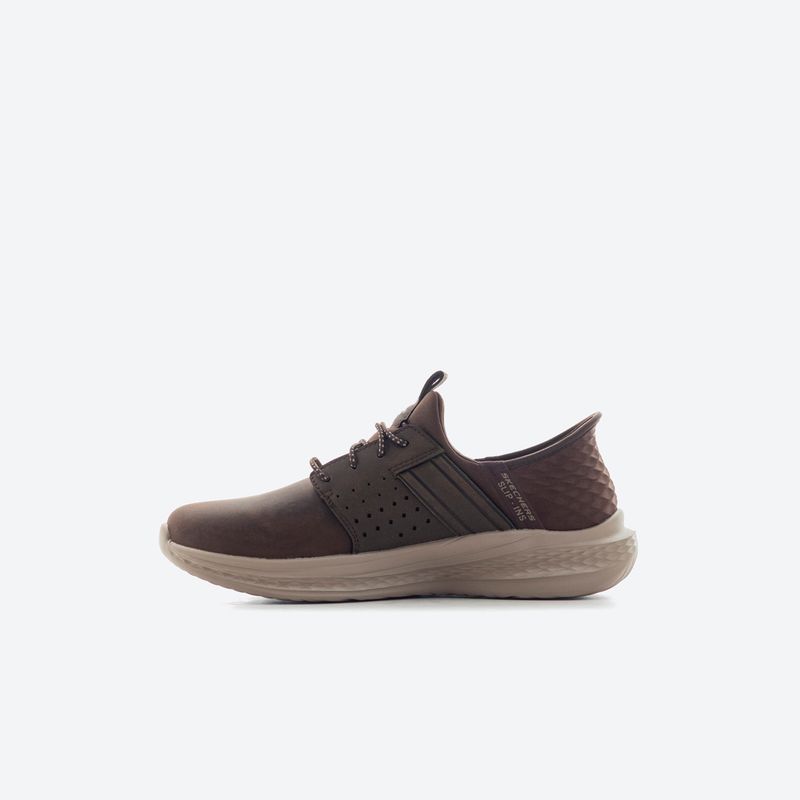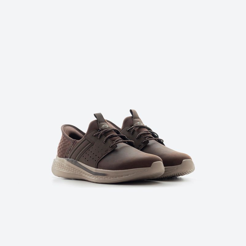 The Skechers Slip-ins Relaxed Fit: Slade - Zachary combine sporty style with everyday functionality. Their slip-on design with bungee laces and the unique Heel Pillow allows for effortless slip-ons, while the combination of leather and synthetic materials provides durability and a premium look. The carbon-infused Skechers Air-Cooled Memory Foam insole offers coolness and comfort, complemented by Goga Mat Arch support for added stability. Ideal for those seeking comfort, style, and practicality in one shoe.