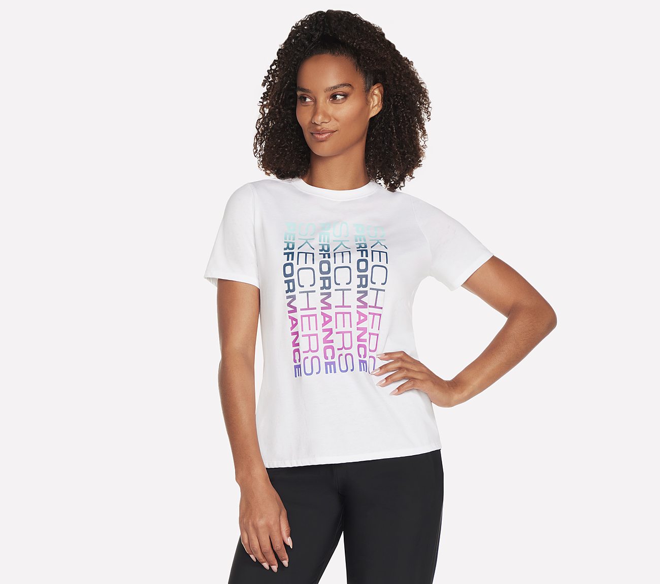 Show out in Skechers Vibrant Glow Short Sleeve Tee. This cotton poly blend short sleeve tee features a ringer sleeve and neck silhouette with a Skechers Performance graphic at center chest.