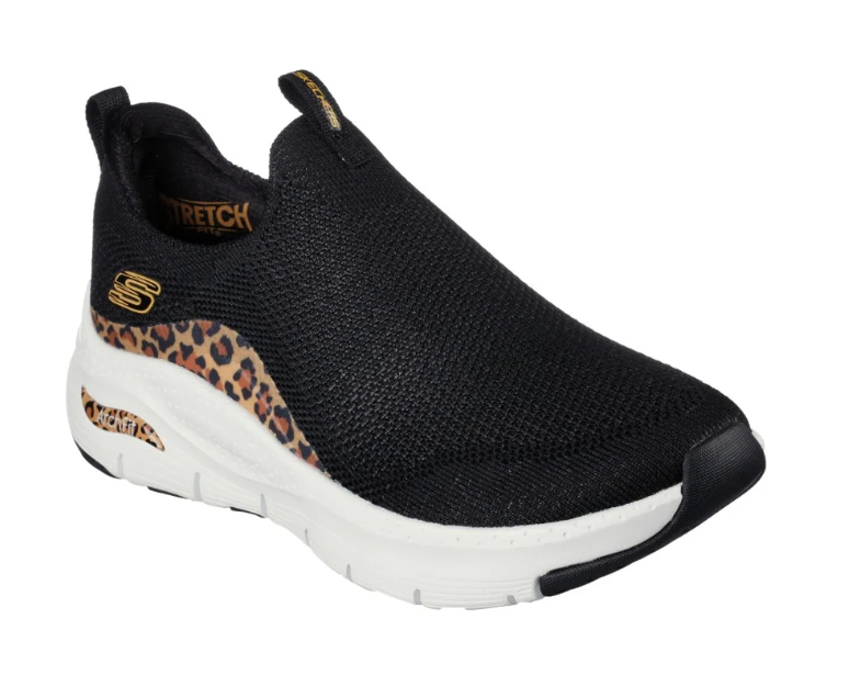 Supportive all-day comfort and glam style meet in Skechers Arch Fit® - New Native. This laceless vegan design features a Stretch Fit® engineered knit upper with leopard print hotmelt overlay detail and a removable Arch Fit® insole.