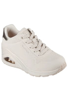 Update your wardrobe with a boost of comfort wearing Skechers Street Uno Wedge - HI Steps. This fashion style features a durabuck upper with metallic duraleather trim, Skechers Air-Cooled Memory Foam® insole, and a platform wedge with a visible Skech-Air® air-cushioned midsole.