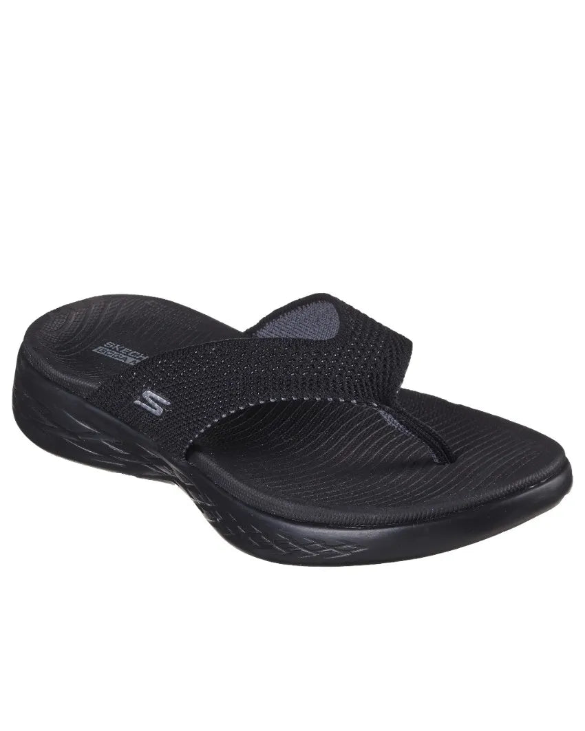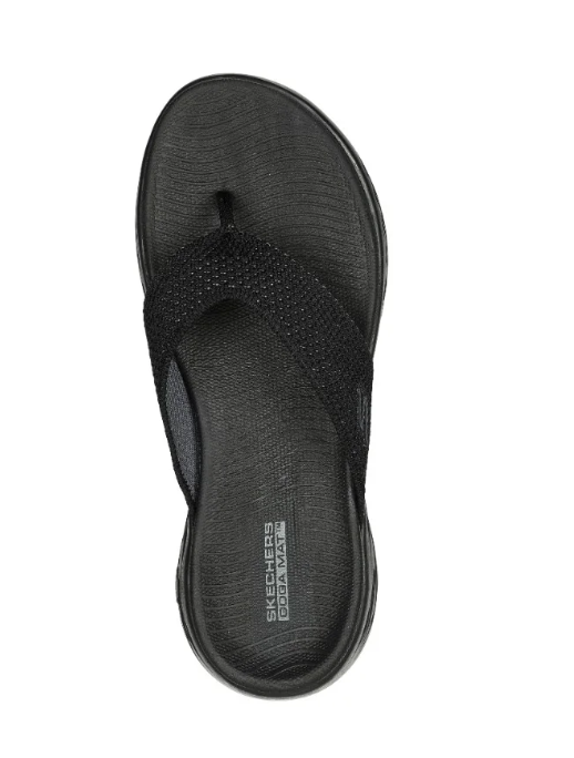 Walk with warm-weather style and comfort wearing Skechers On-the-GO® 600 - Flourish. This sporty 3-point thong sandal features a soft two-toned woven mesh upper, supportive contoured Goga Mat® footbed design and lightweight 5GEN® cushioning.
