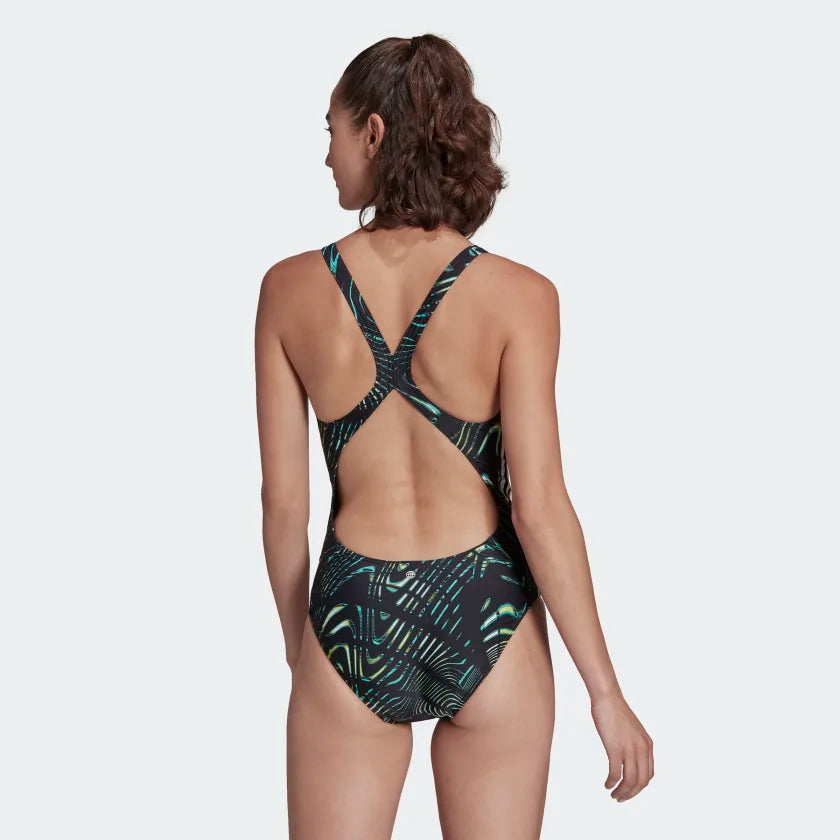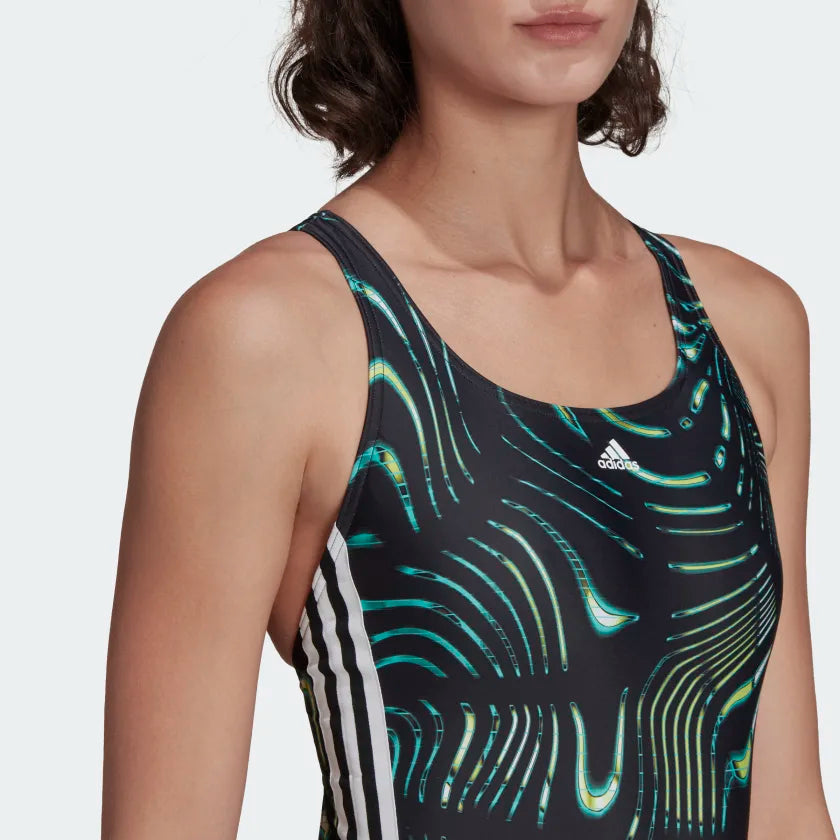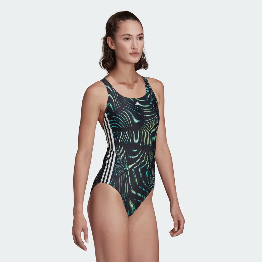 From the vast seas to tiny plants, all of nature is connected. Inspired by the patterns of ocean currents and the veins of plants, the electric print on this adidas swimsuit highlights their shared geometry. It's made of soft, comfortable fabric and is fully lined. Signature 3-Stripes on the sides add a sporty touch. This garment is made of chlorine-resistant fabric that features ECONYL® regenerated yarn.