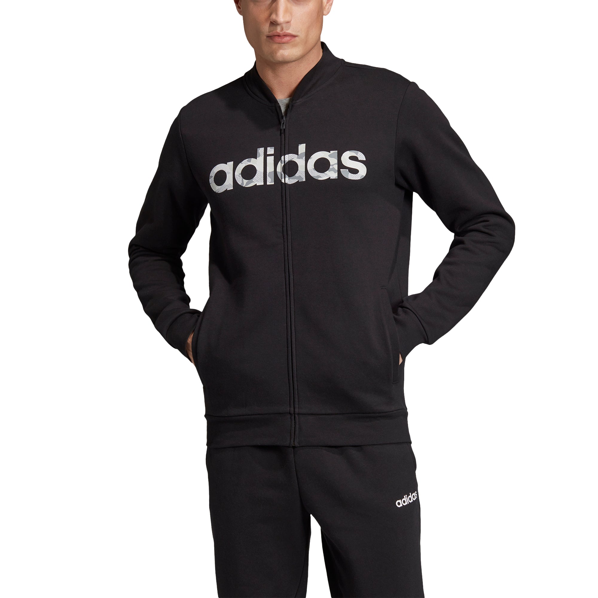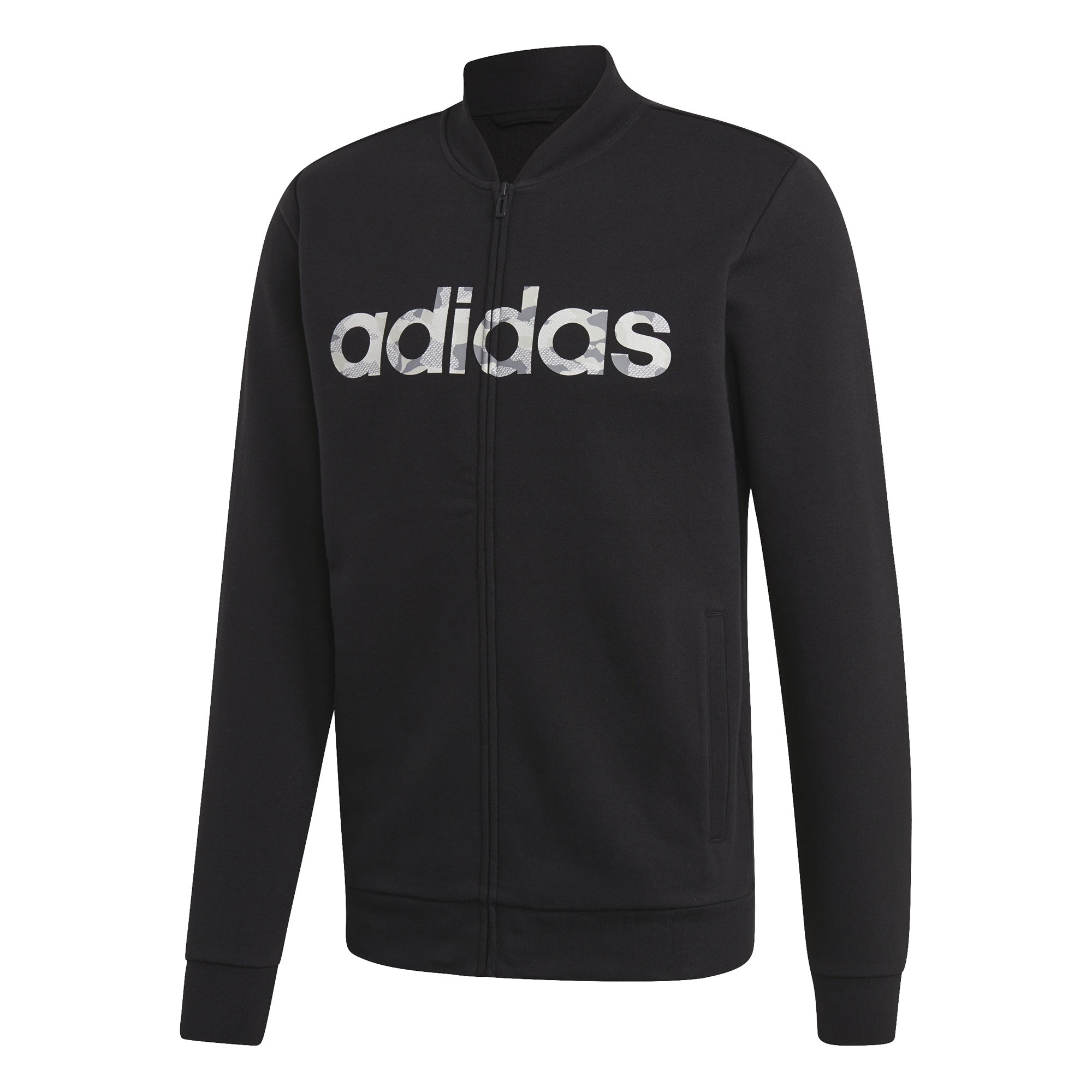 Carve out time for post-workout relaxation in this full-zip bomber jacket. Made of soft cotton fleece, it includes ribbed cuffs and hem for stay-put comfort. Side pockets stow your phone and keys. A camouflage adidas graphic in front provides a street-ready finish.