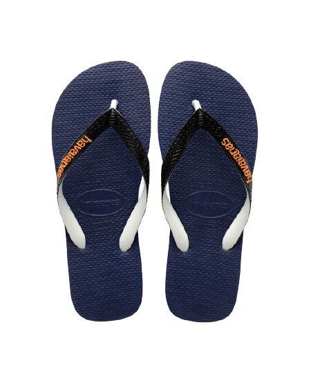 Havaianas Top Mix Navy Blue/Black Thongs. Mix it up this summer in our new season thongs for men. Classic Top navy blue Havaianas with matching two-tone black and white Top straps and a contrast orange Havaianas rubber logo to complete the pair.