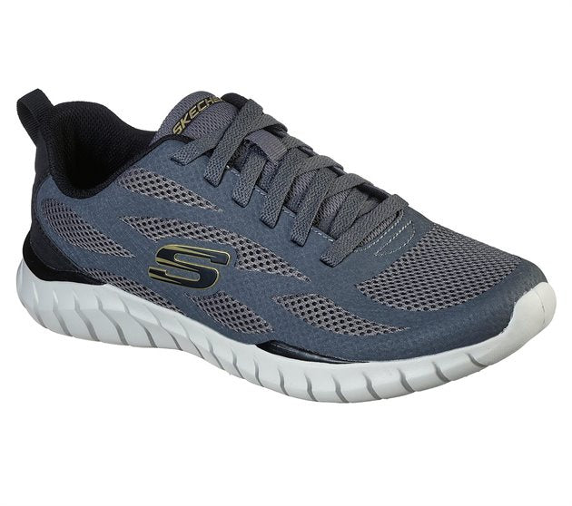 Breakthrough your workout barriers in flexible lightweight comfort and sleek style with the SKECHERS Overhaul - Blokade shoe. Soft woven mesh fabric and smooth synthetic upper in a lace up sporty walking and training sneaker with stitching accents and Air Cooled Memory Foam insole.