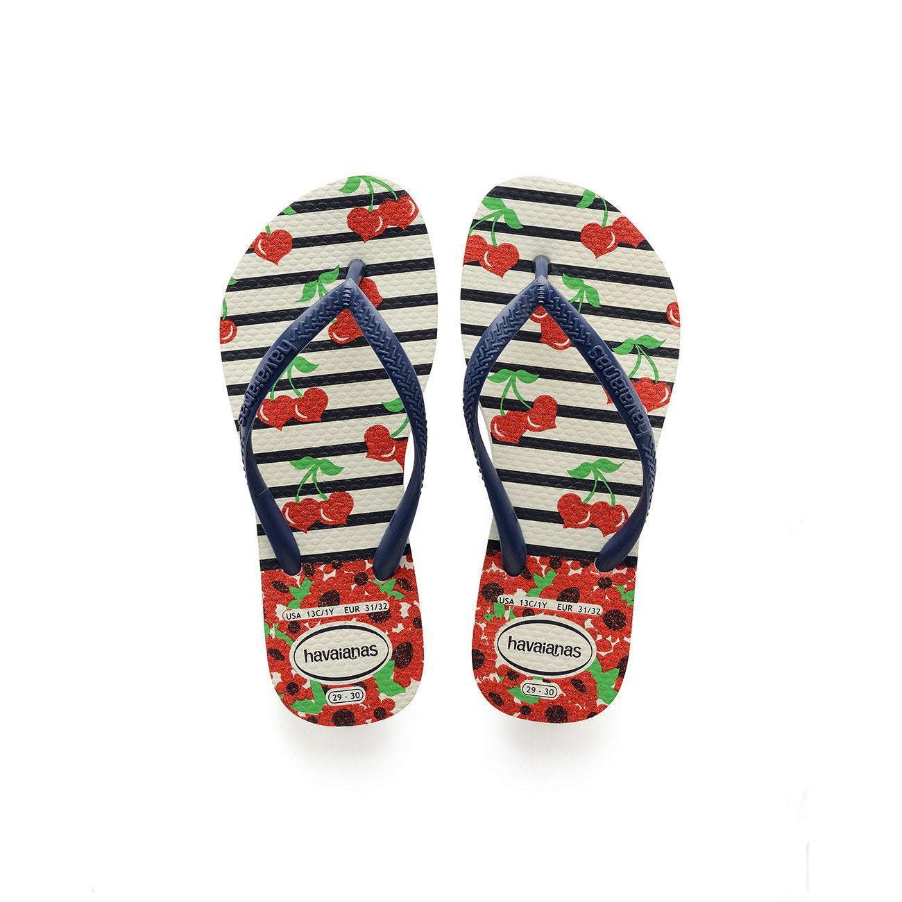 It's all about the glitter sole with the Kids Slim Fashion. Featuring our bestselling slim silhouette in a glitter cherry print or a glitter tribal print. A tonal Havaianas logo on slim straps completes this stylish look.