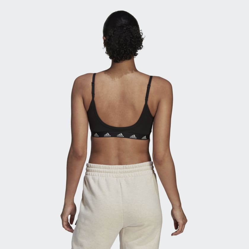 Like going braless, but better. This adidas bra is a comfy essential you'll want to live in 24/7. With no pads and no wires, the simple design is pure comfort. It's made of soft-touch fabric, with moisture-absorbing AEROREADY. Adjust the thin straps to fine-tune the fit.