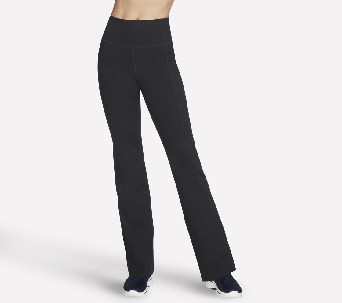 Designed for active performance with our signature comfort the Skechers GO WALK Wear™ Evolution II Flare Pant offers stylish versatility in a flattering fit. This high-waisted active pant features a GOFLEX® moisture-wicking nylon and spandex blend fabric, flattering V-back waistband, chafe-free seams for total comfort, flare hem, exterior side pockets and back pockets.