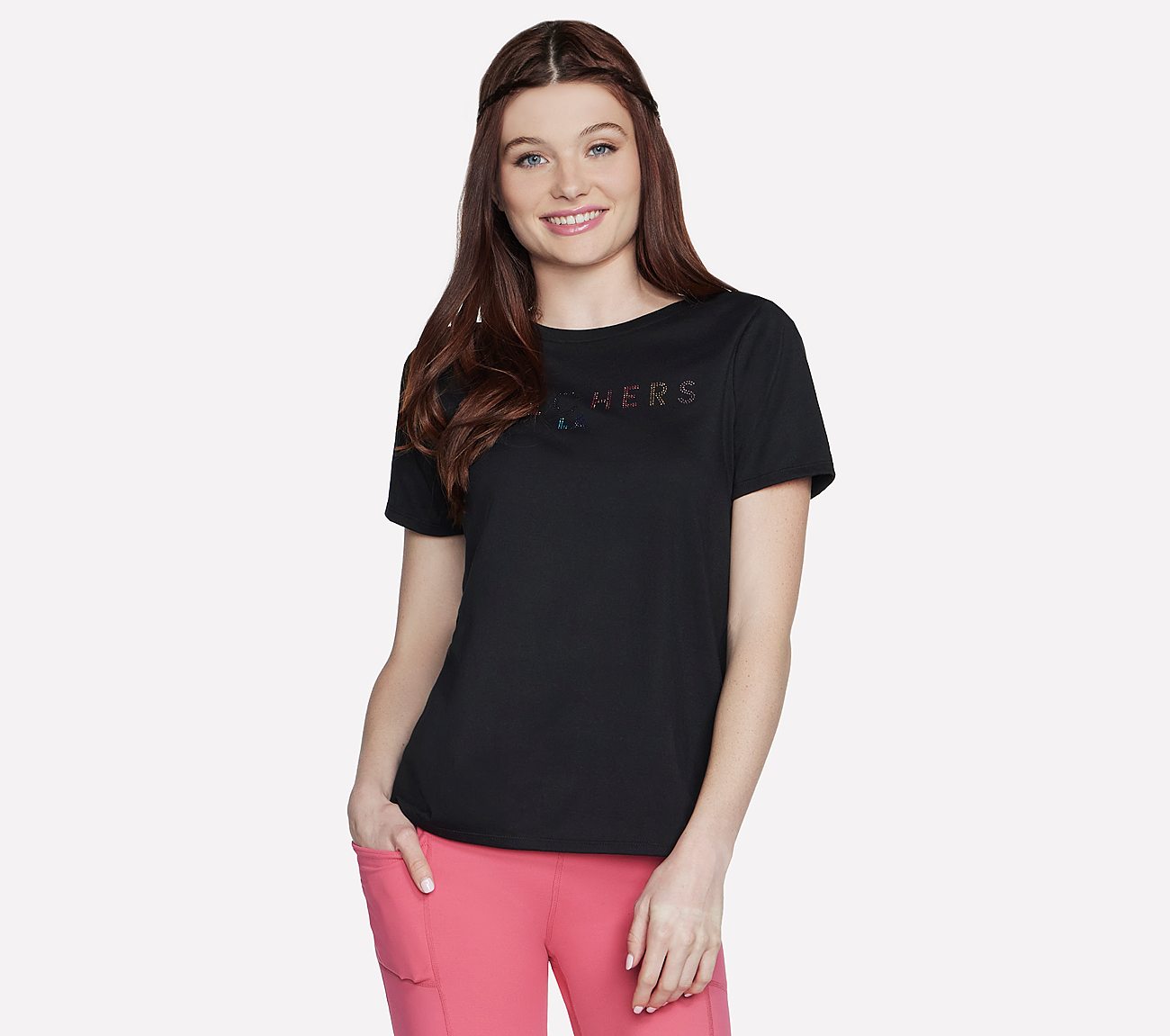 Show out in glitzy brand pride and comfort wearing Skechers Shine Tee. This cotton poly blend short sleeve tee features a ringer sleeve and neck silhouette with a Skechers silver foil graphic at center chest
