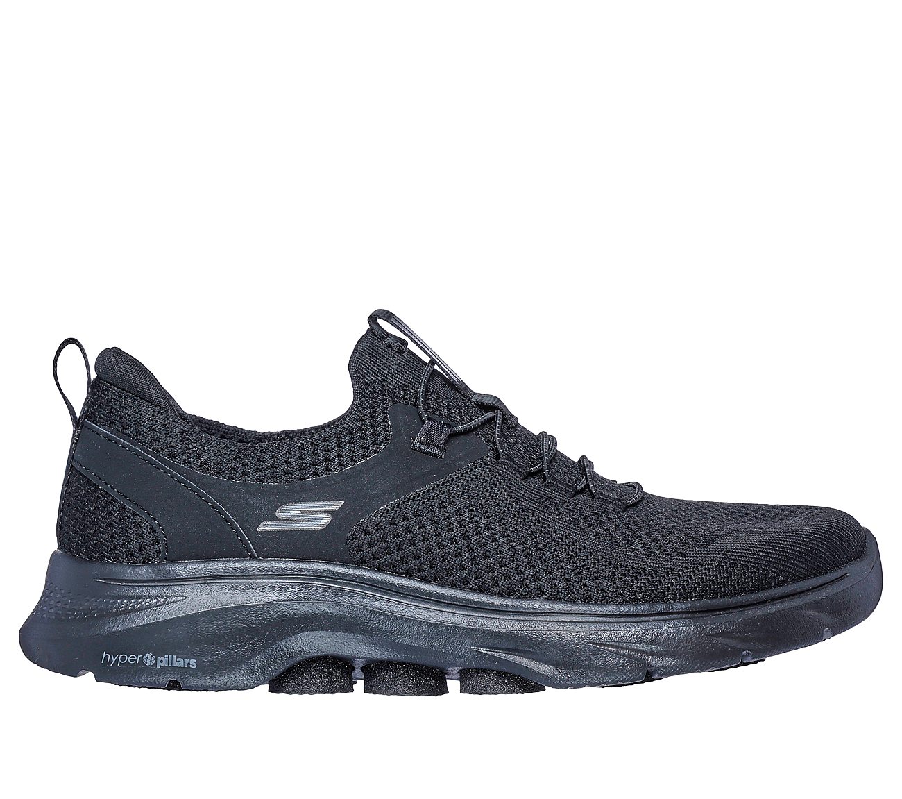 Walk in easy-wearing comfort with Skechers GO WALK 7™ - Bling. This Bungee Lace up slip on vegan style features a Stretch Fit® engineered knit upper, a Skechers Air-Cooled Goga Mat™ insole, lightweight ULTRA GO® cushioning, and high-rebound Hyper Pillar Technology™ for added support.