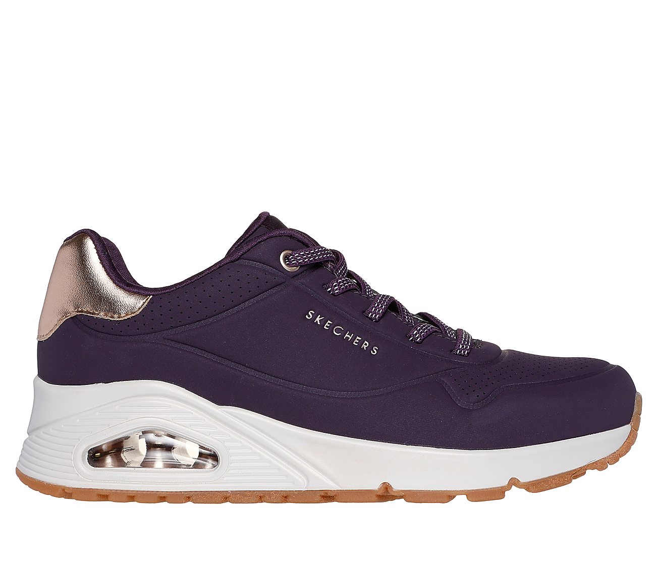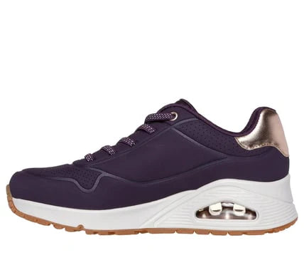 Enjoy classic style this season wearing Skechers Street™ Uno - Shimmer Away. This on-trend sneaker features a synthetic durabuck upper with metallic heel trim, stretch laces, a Skechers Air-Cooled Memory Foam® insole and a visible Skech-Air® airbag midsole.