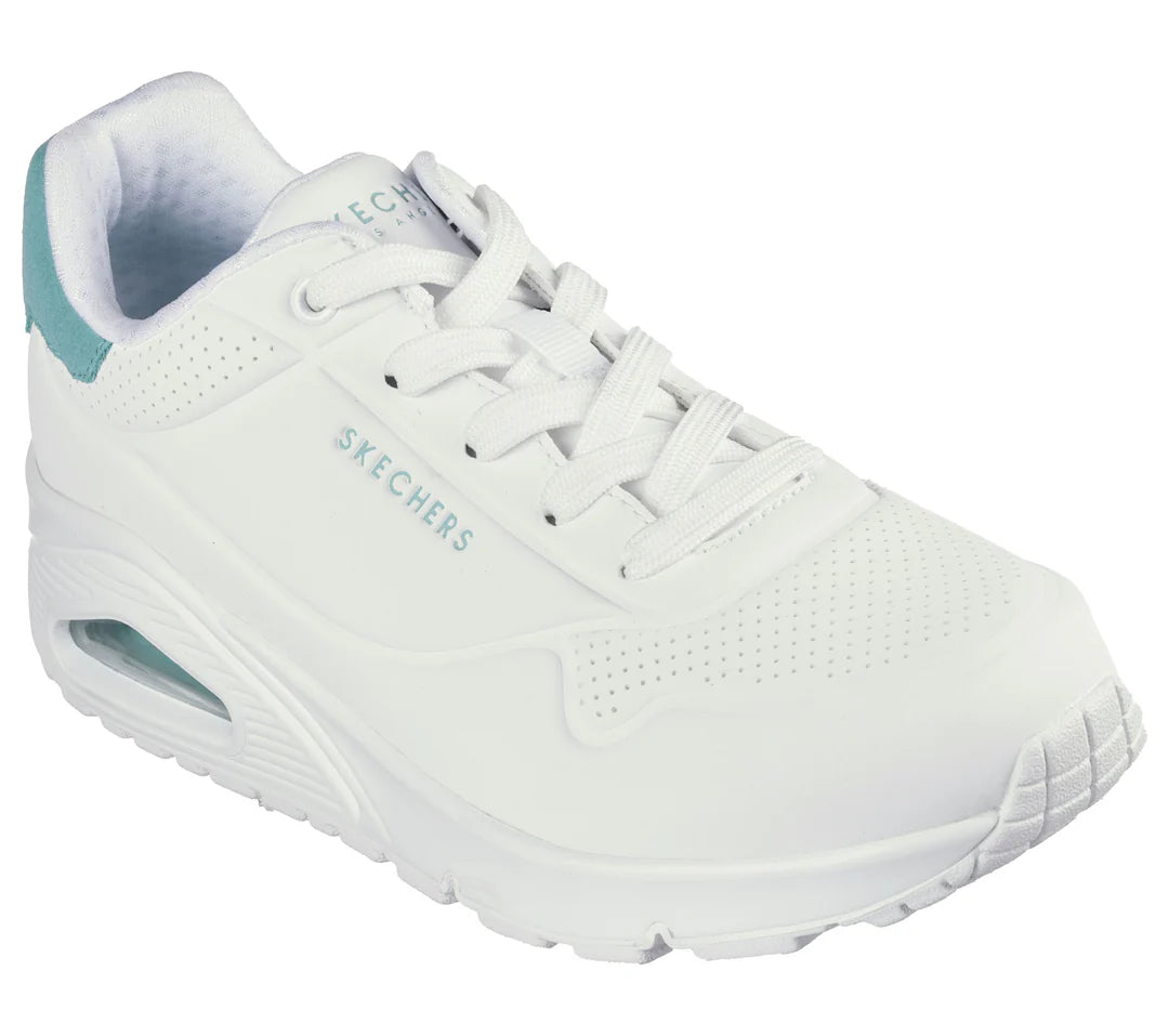Make a stylish statement in comfort wearing Skechers Street™ Uno - Pop Back. This lace-up fashion jogger features a durabuck upper with contrast suede trim, a Skech-Air® visible airbag midsole, Skechers Air-Cooled Memory Foam® insole, and a second set of laces.