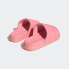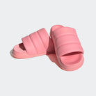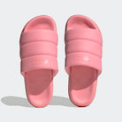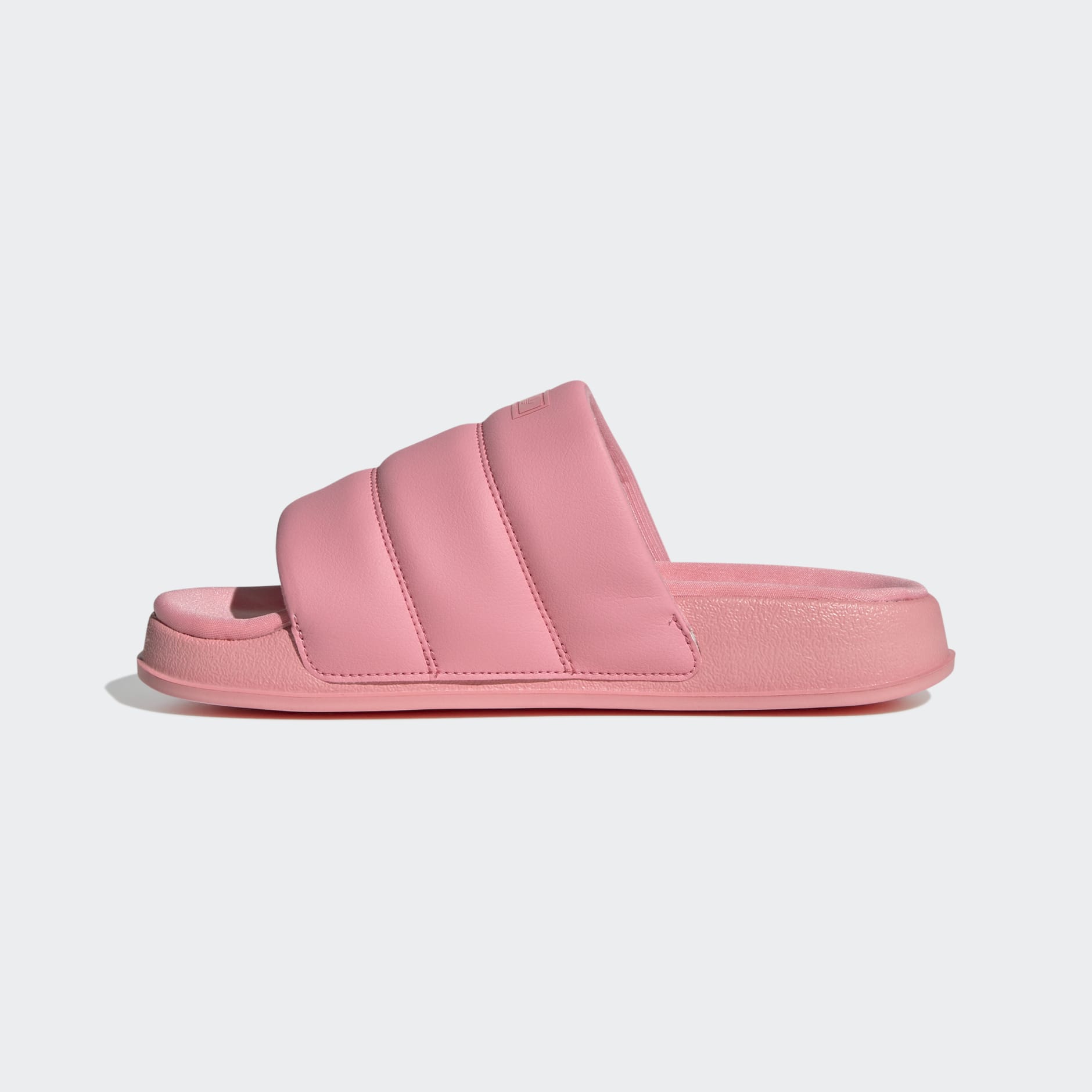 Puffed-up perfection. With a wide upper designed in three puffy stripes, these laid-back adidas slides go all out on comfort. The padded footbed hugs your feet as you walk, and smooth synthetic leather looks seriously sleek. A Trefoil logo along each side makes a subtle appearance in tonal hues, and a synthetic outsole keeps a good grip on every step.